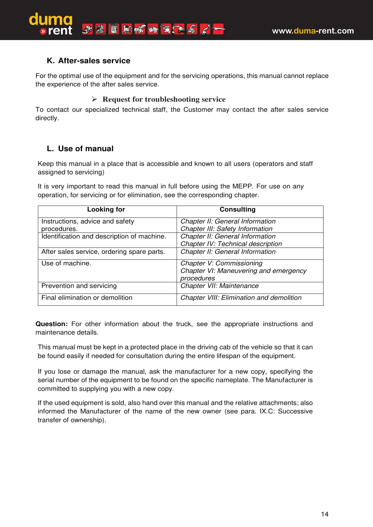 For the optimal use of the equipment and for the servicing operations, this manual cannot replace