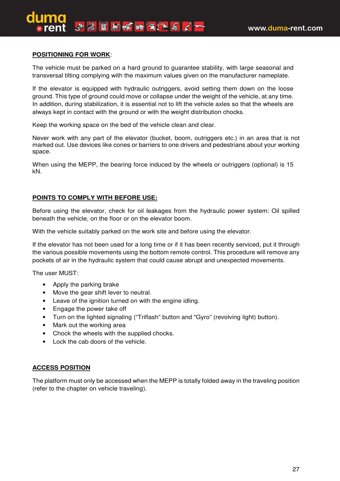 With the vehicle suitably parked on the work site and before using the elevator.