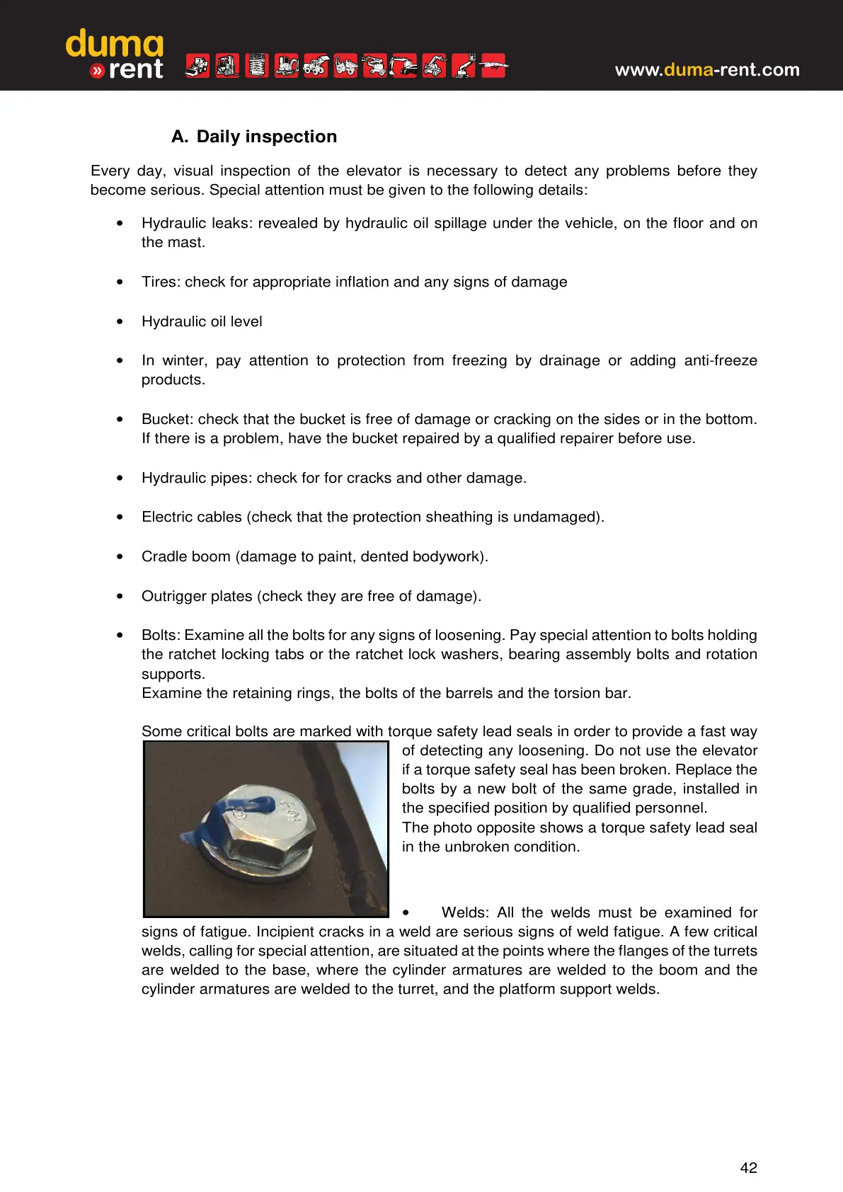 • Bolts: Examine all the bolts for any signs of loosening. Pay special attention to bolts holding