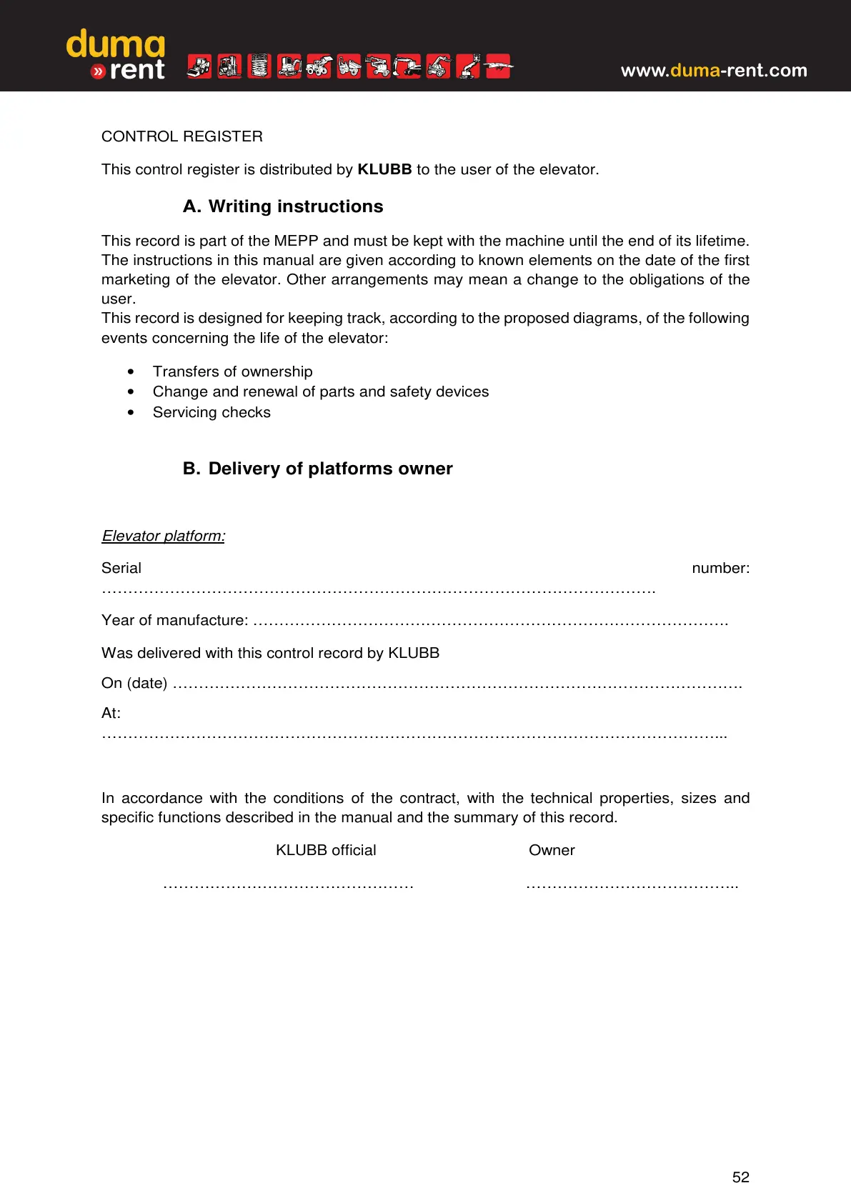 This record is part of the MEPP and must be kept with the machine until the end of its lifetime.