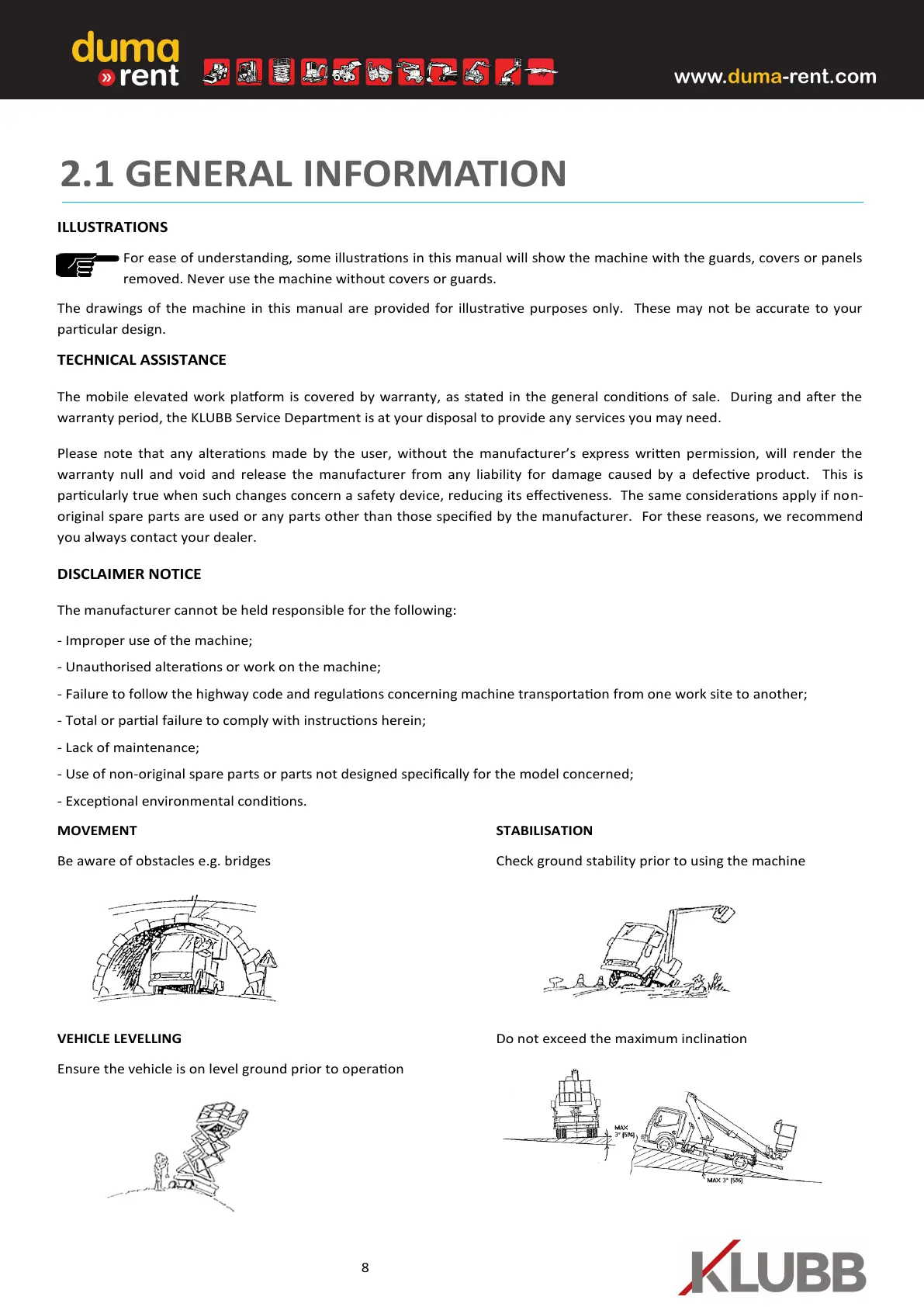 The mobile elevated work plaorm is covered by warranty, as stated in the general condions of sale. During and aer the