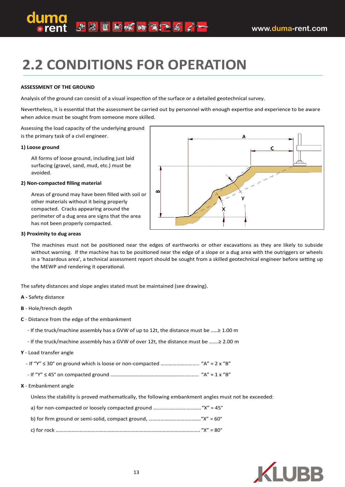 - If “Y” ≤ 45° on compacted ground ……………………………….……………............. “A” ≈ 1 x “B”