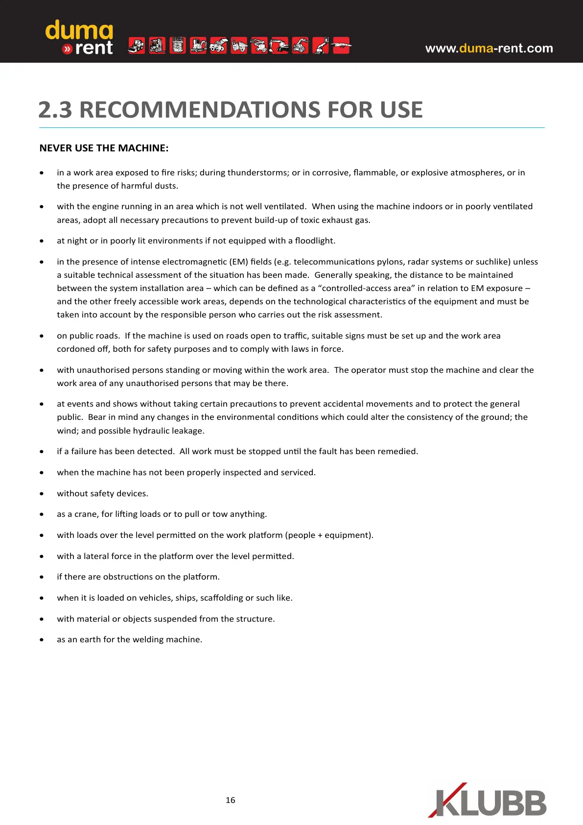 • with unauthorised persons standing or moving within the work area. The operator must stop the machine and clear the