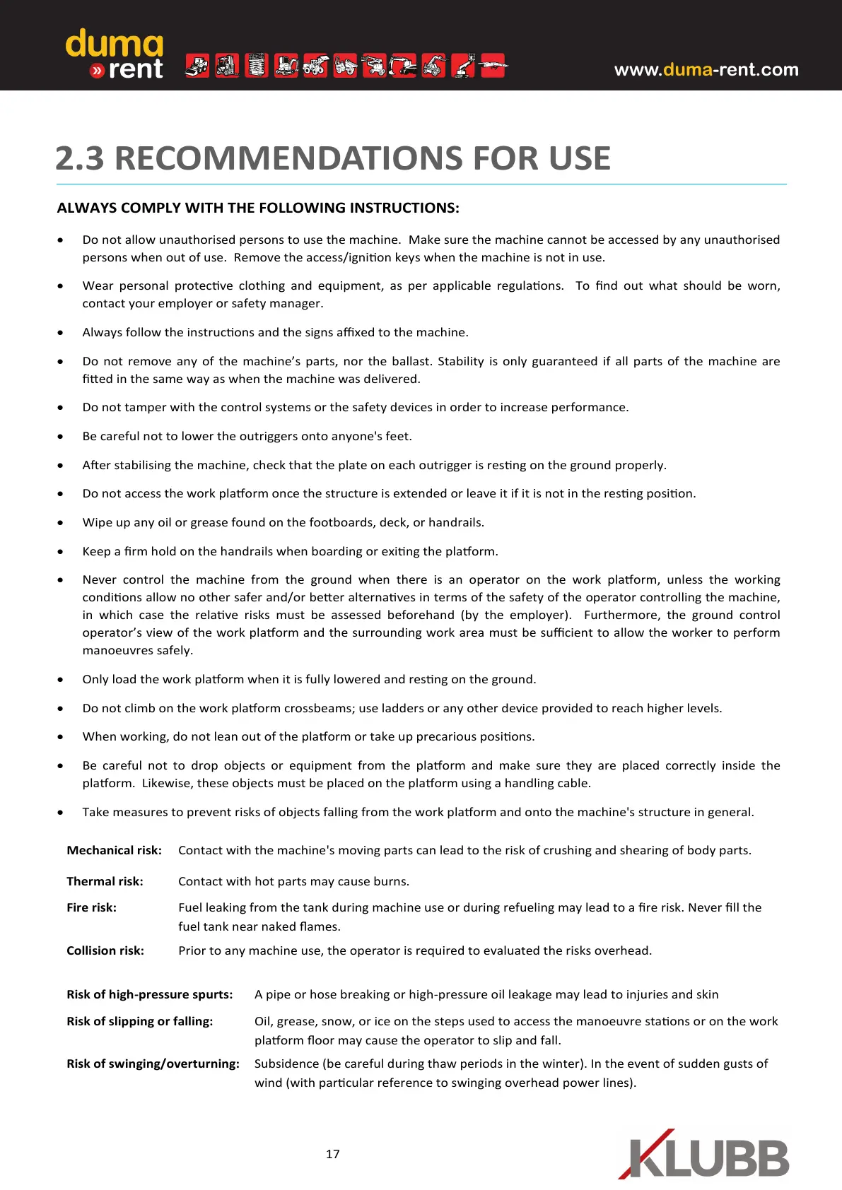 • Take measures to prevent risks of objects falling from the work plaorm and onto the machine's structure in general.