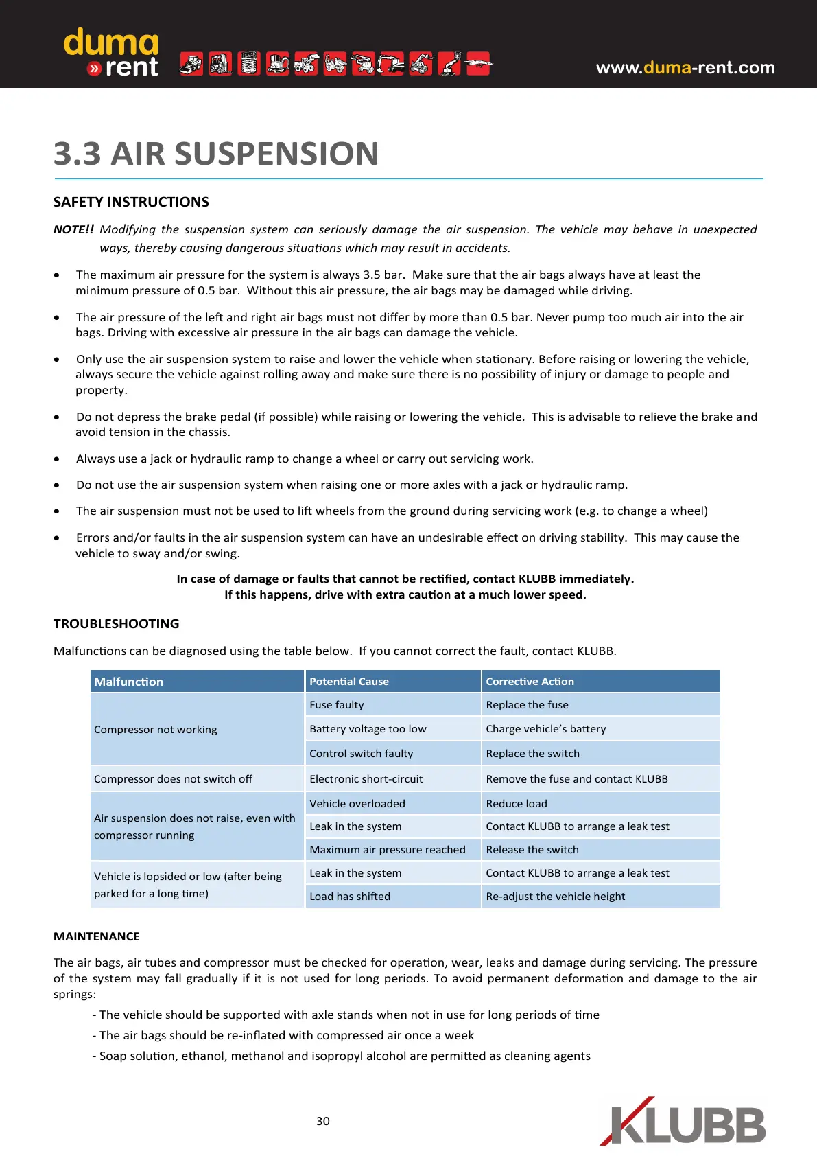 • The maximum air pressure for the system is always 3.5 bar. Make sure that the air bags always have at least the