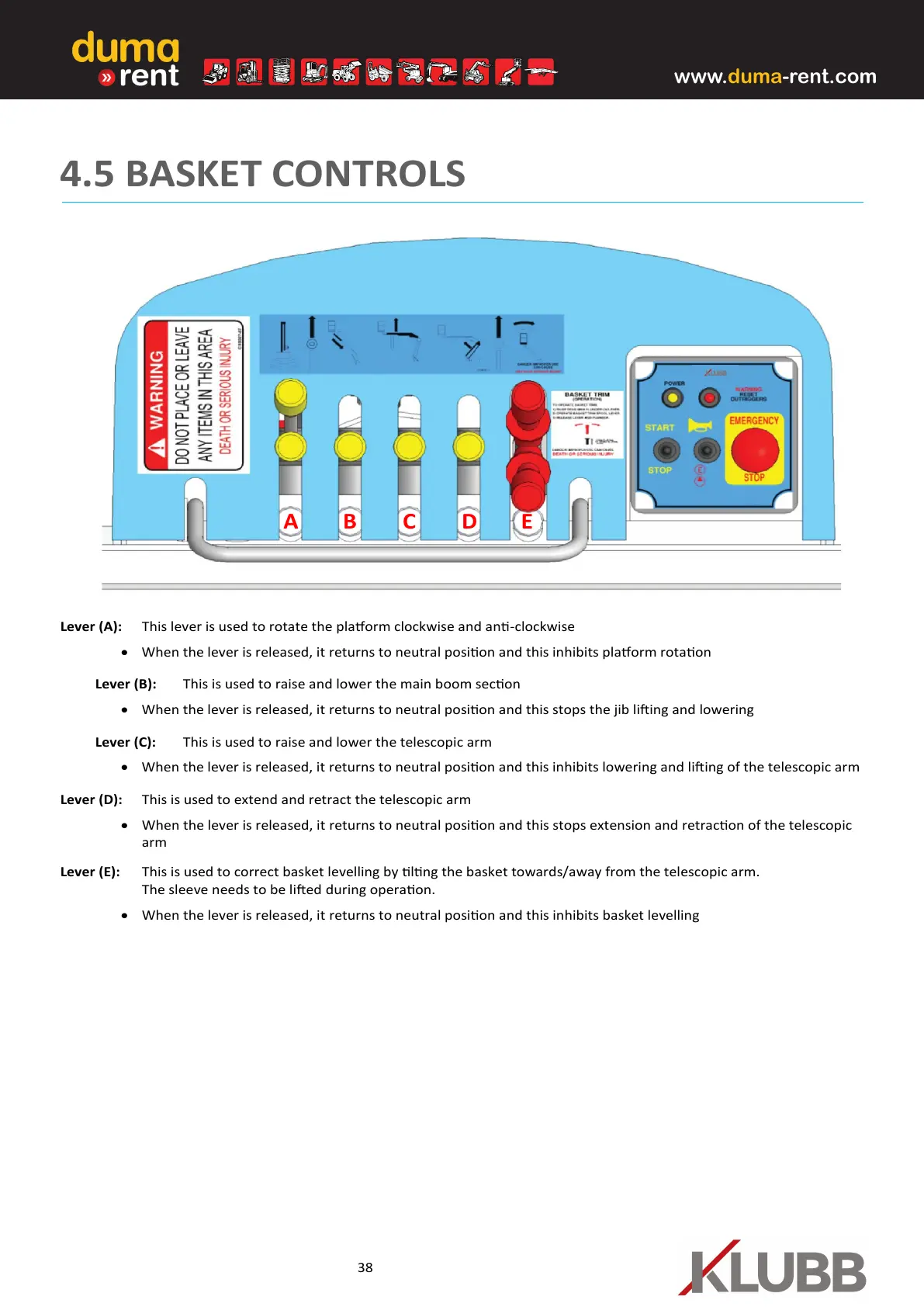 Lever (E): This is used to correct basket levelling by lng the basket towards/away from the telescopic arm.