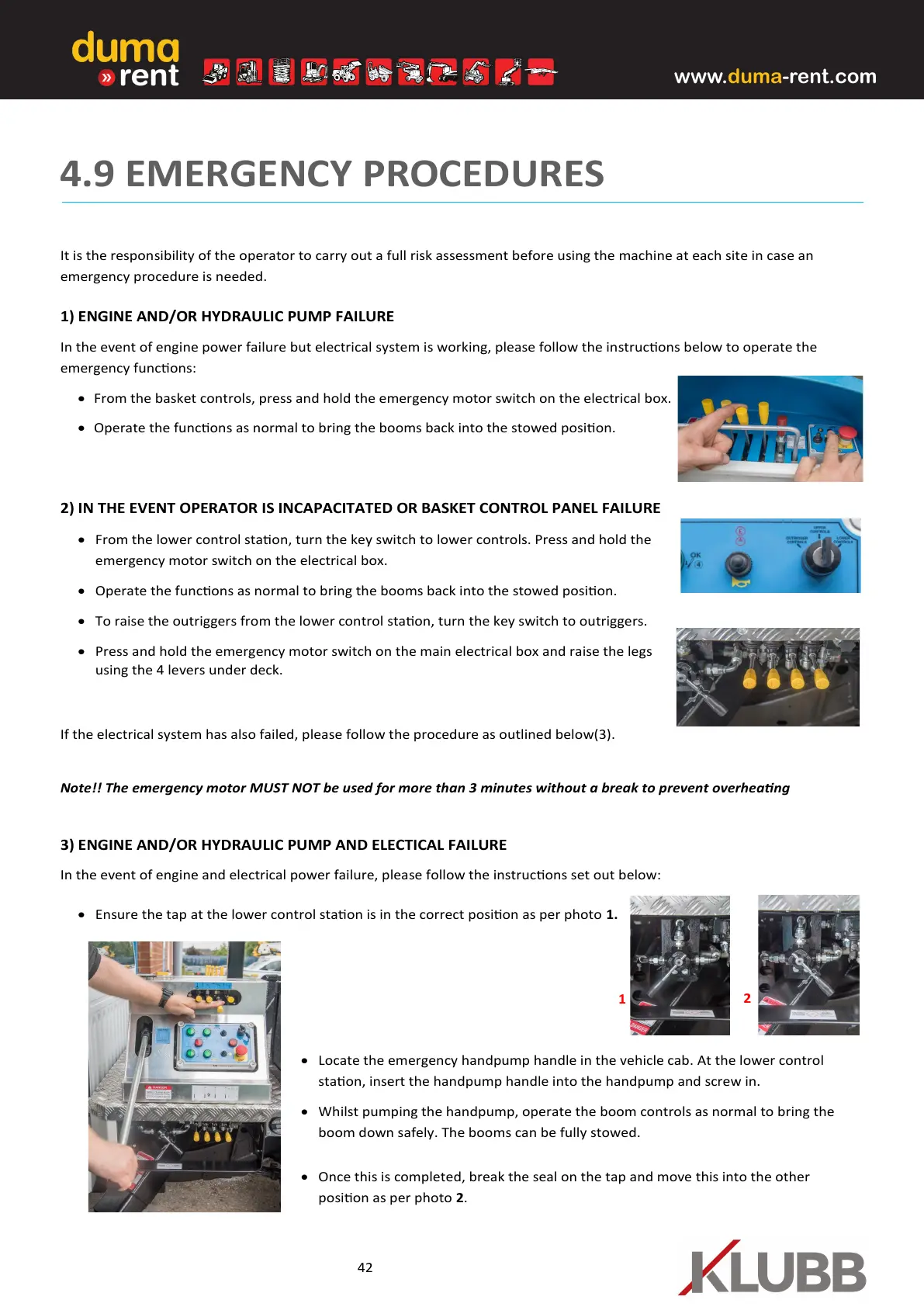 Note!! The emergency motor MUST NOT be used for more than 3 minutes without a break to prevent overheang
