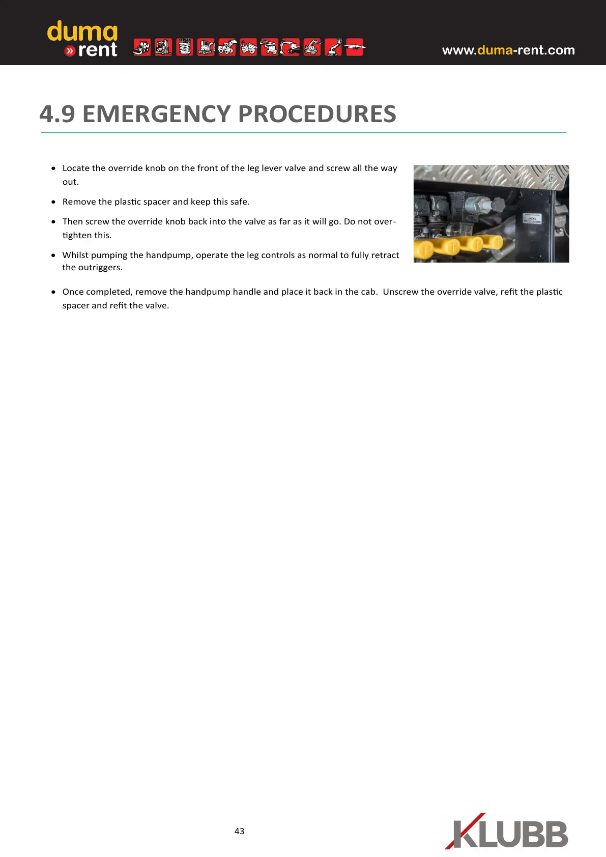 • Once completed, remove the handpump handle and place it back in the cab. Unscrew the override valve, ret the plasc