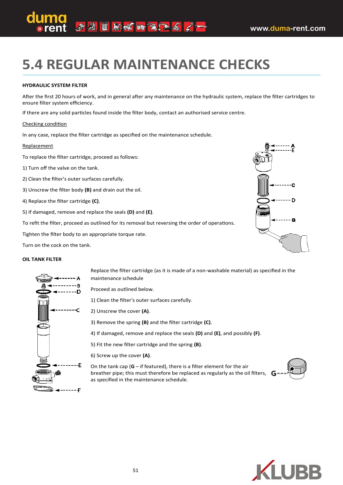 Aer the rst 20 hours of work, and in general aer any maintenance on the hydraulic system, replace the lter cartridges to