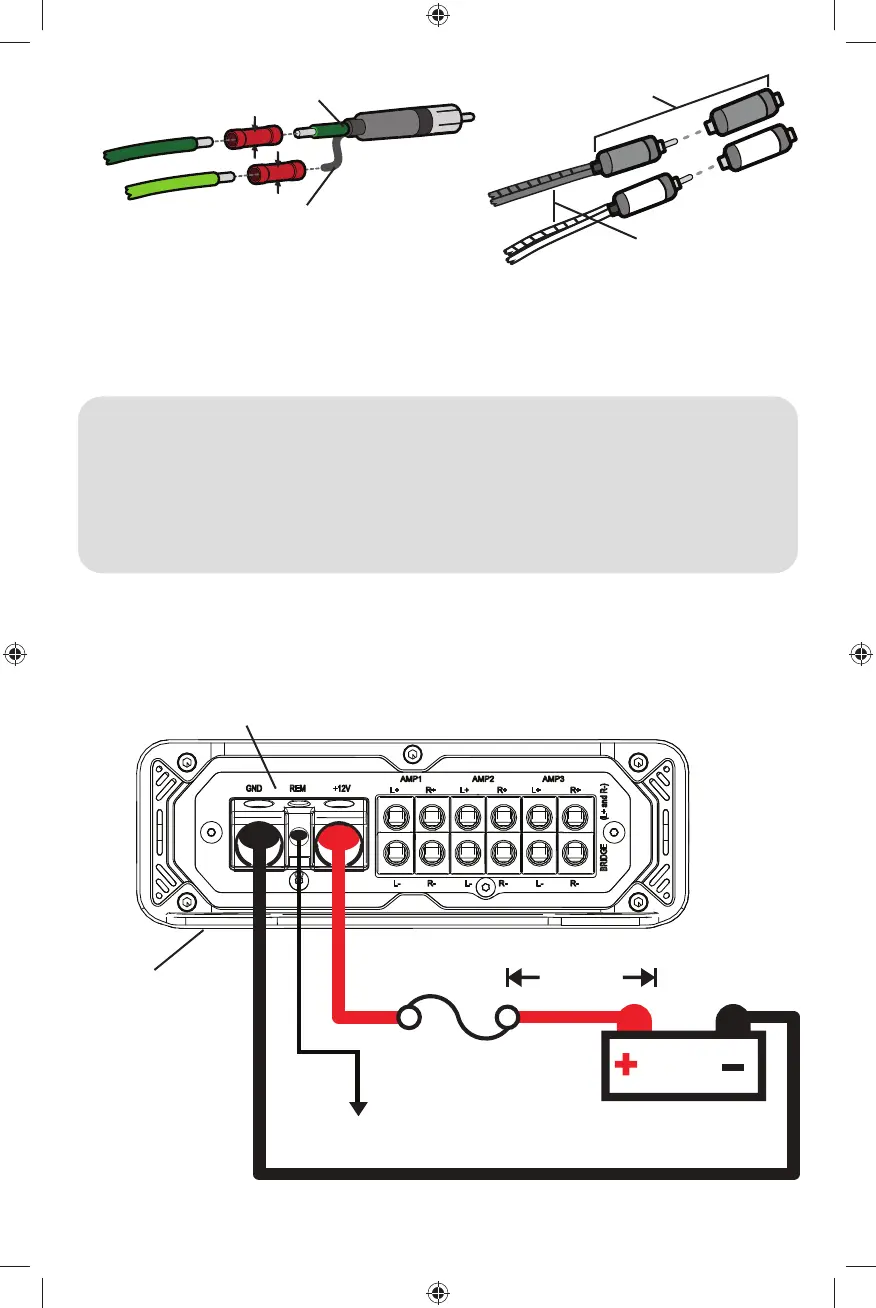 Install a fuse within 7” (18cm) of the battery and in-line with the power cable connected to your amplifi er.
