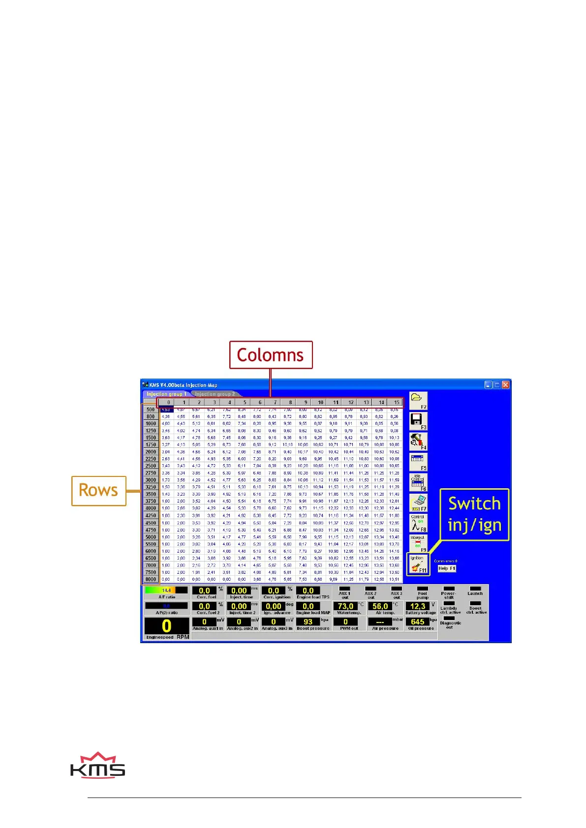 The main screen consists of two spreadsheets (ignition and injection) of which only one is visible at