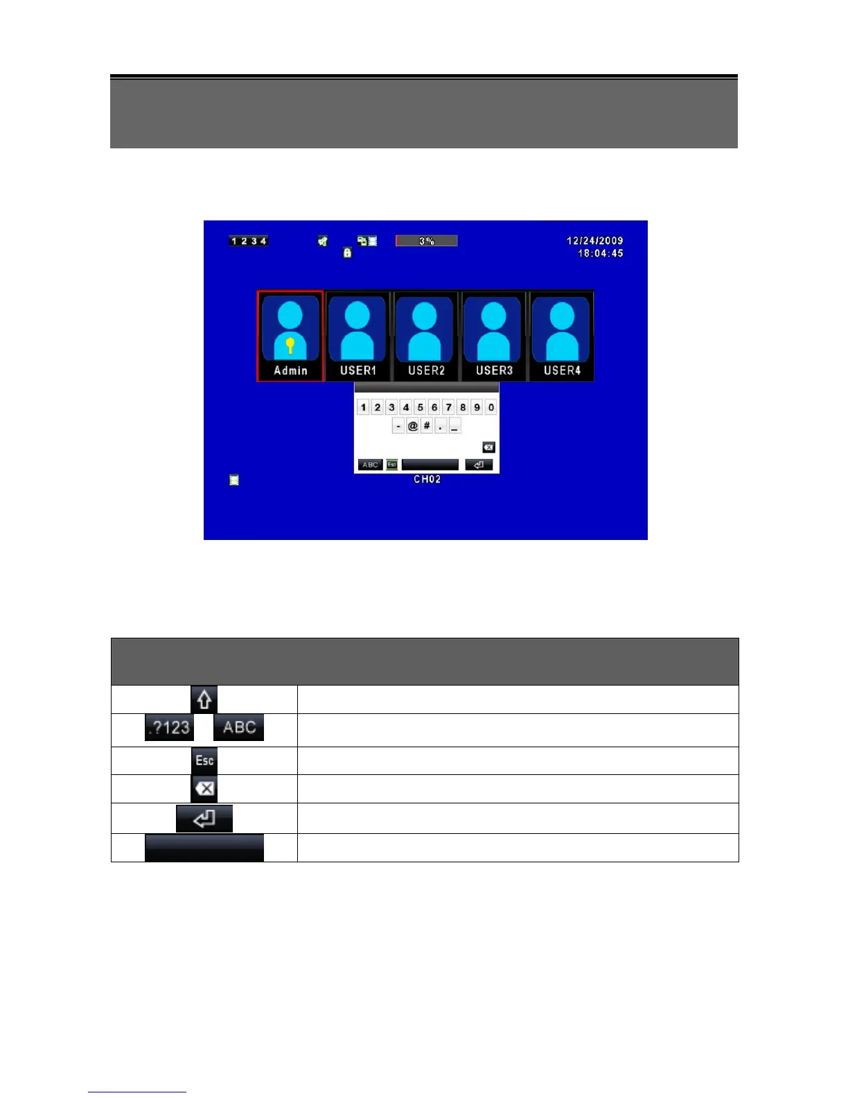 To enter the main menu and setup the DVR, please log-in account and enter user
