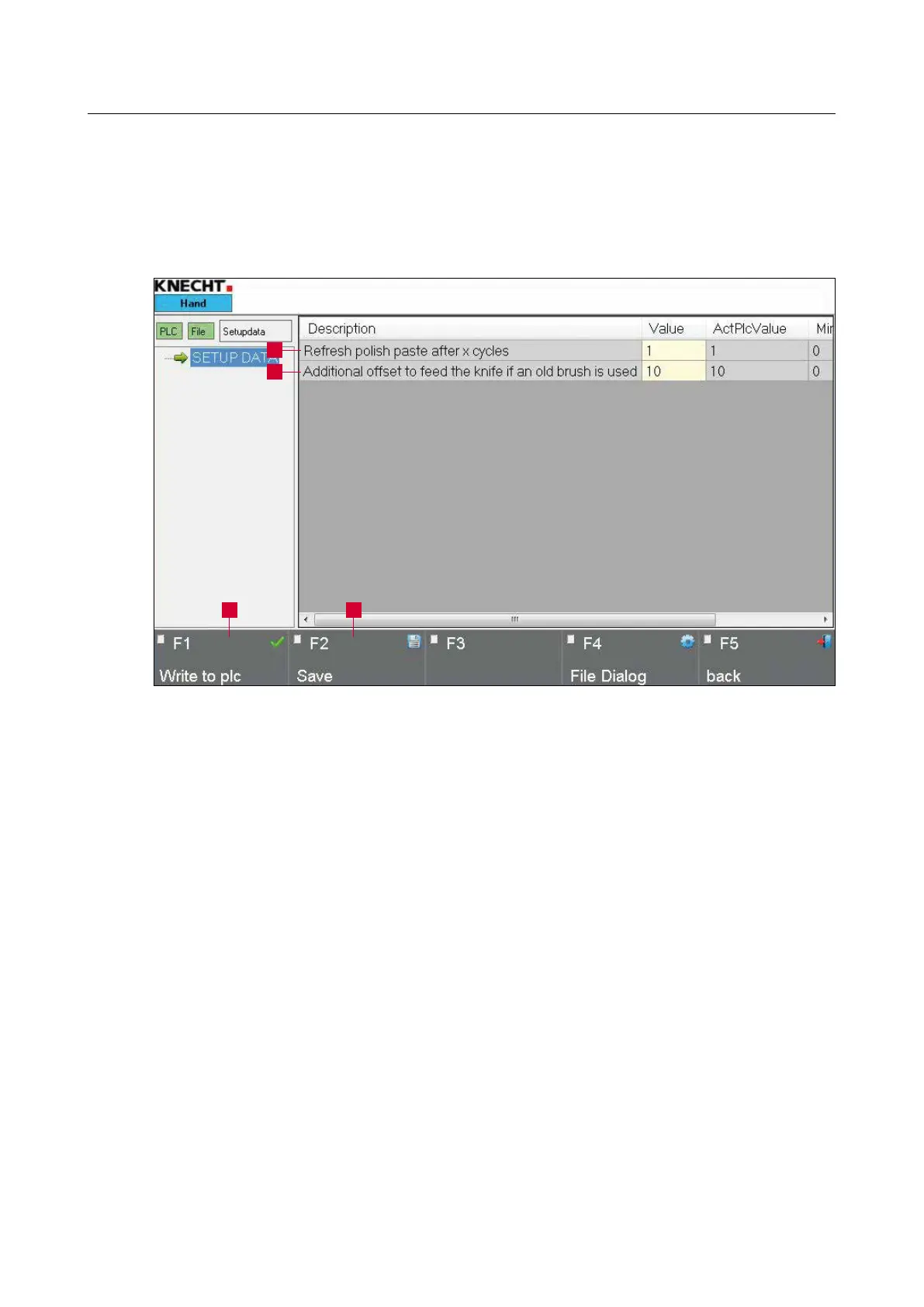 The settings data are called via the main menu “F4 Menu” (8-1/16) followed by “F2 Settings