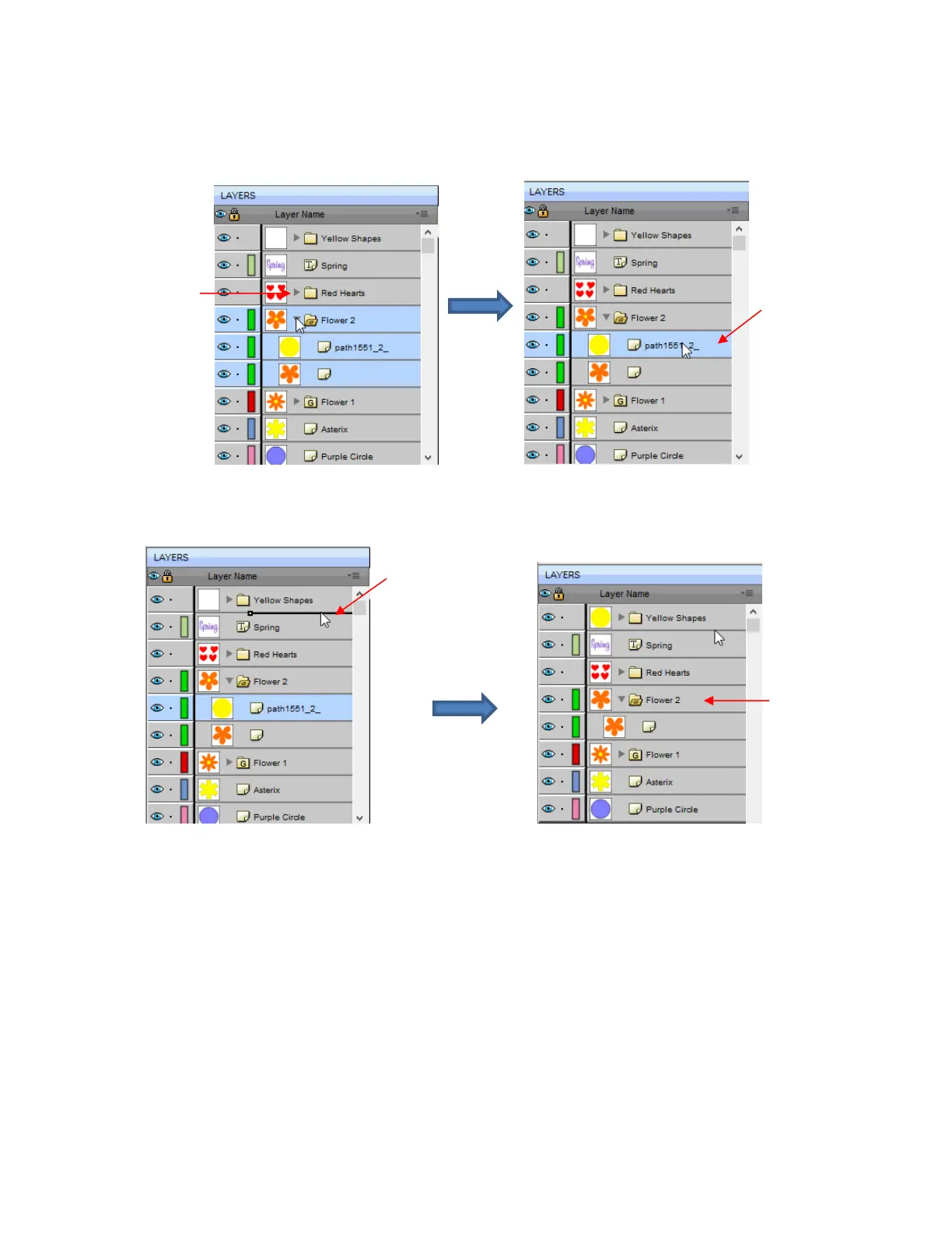 the flowers in the layers named Flower 1 and Flower 2, can be similarly dragged and dropped into the