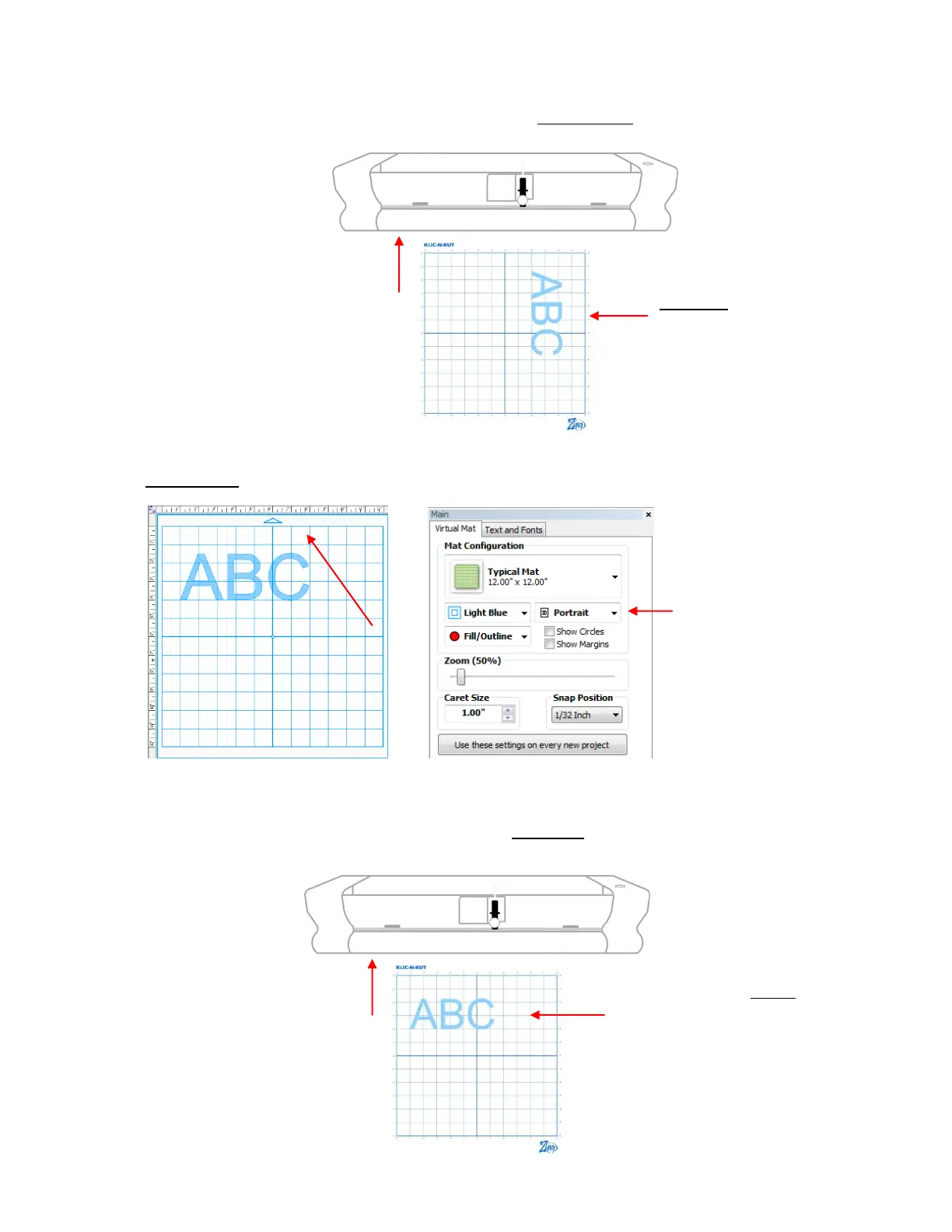 In Portrait mode, the arrow on the virtual mat will point upwards. When you draw or cut out the “ABC”
