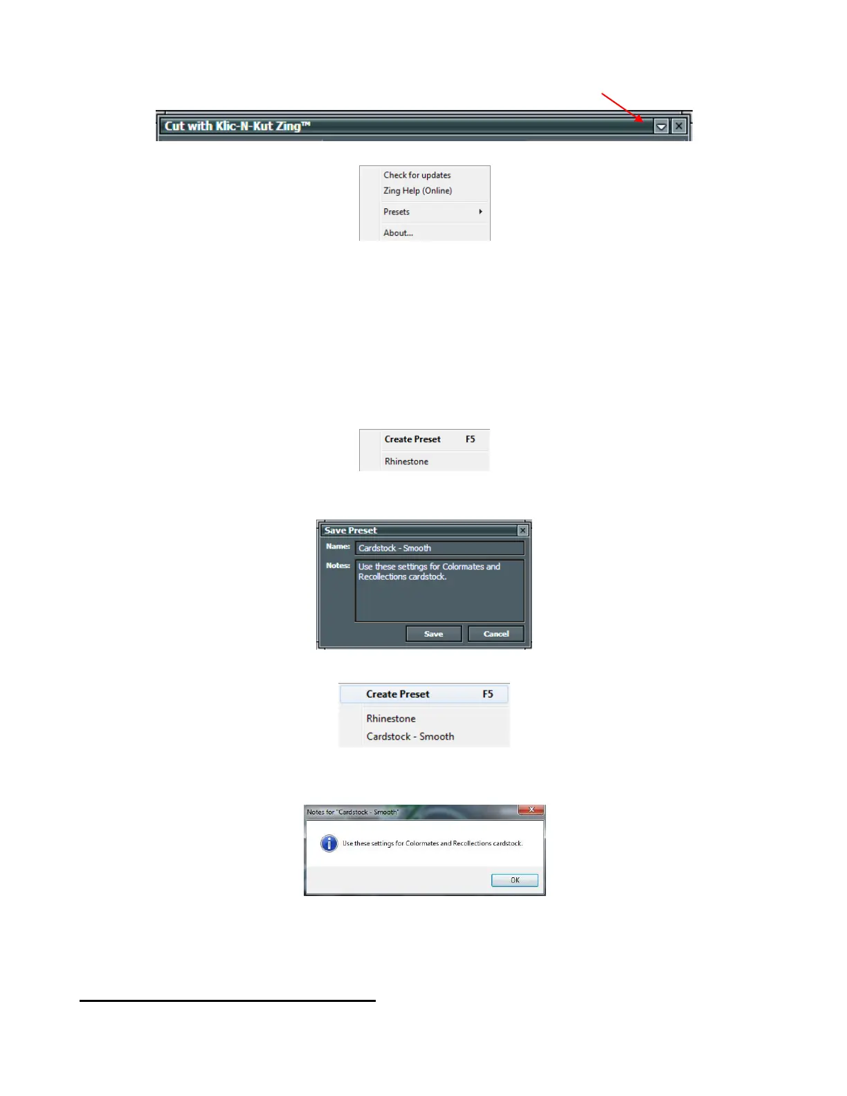 Clicking on a Preset in your list will then change the current settings in the Cut with Klic-N-Kut Zing
