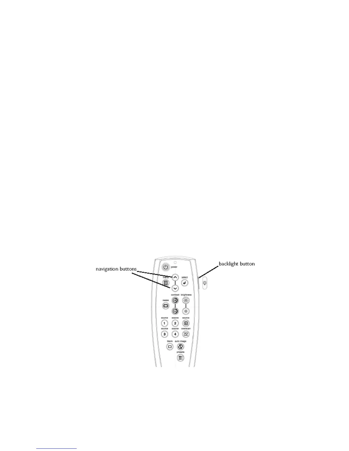 Press the remote’s Menu button to open the projector’s menu system. Use the arrow buttons to navigate,