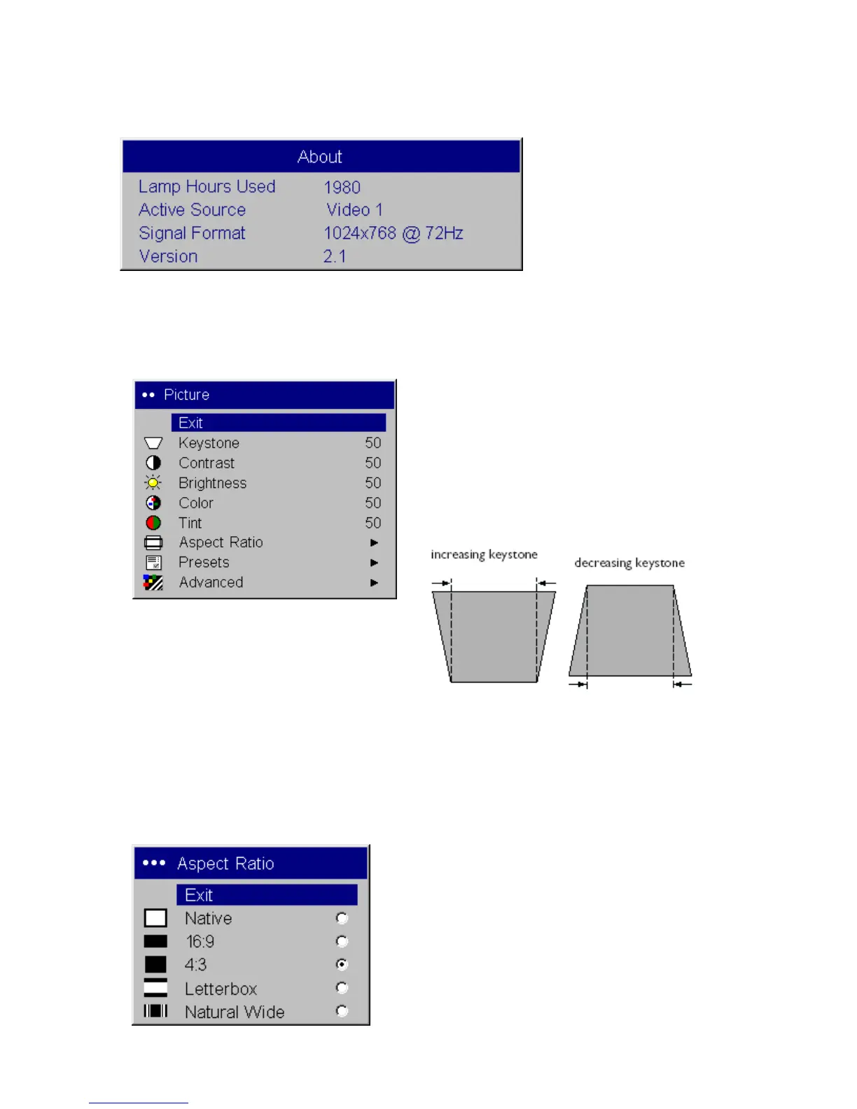 Brightness: changes the intensity of the image. You can also adjust brightness from the keypad.