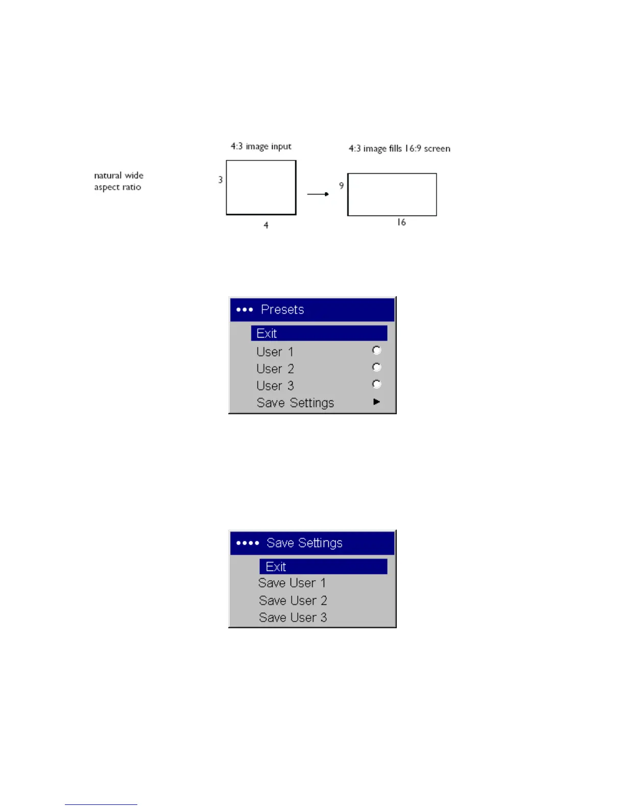 To set a preset for the current source, adjust the image, select Save Settings in the Presets menu, then