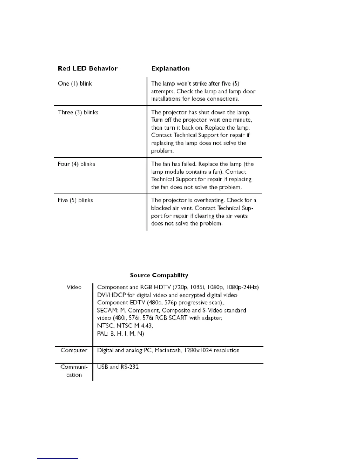 Knoll HD282 - Red LED Behavior and Projector Errors; Source Compatibility