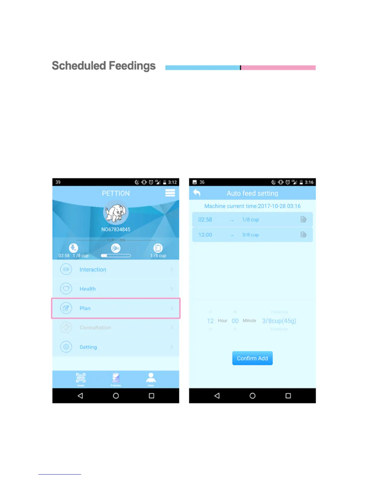 Feed Setting” screen. From here you can setup multiple feedings for your pet.