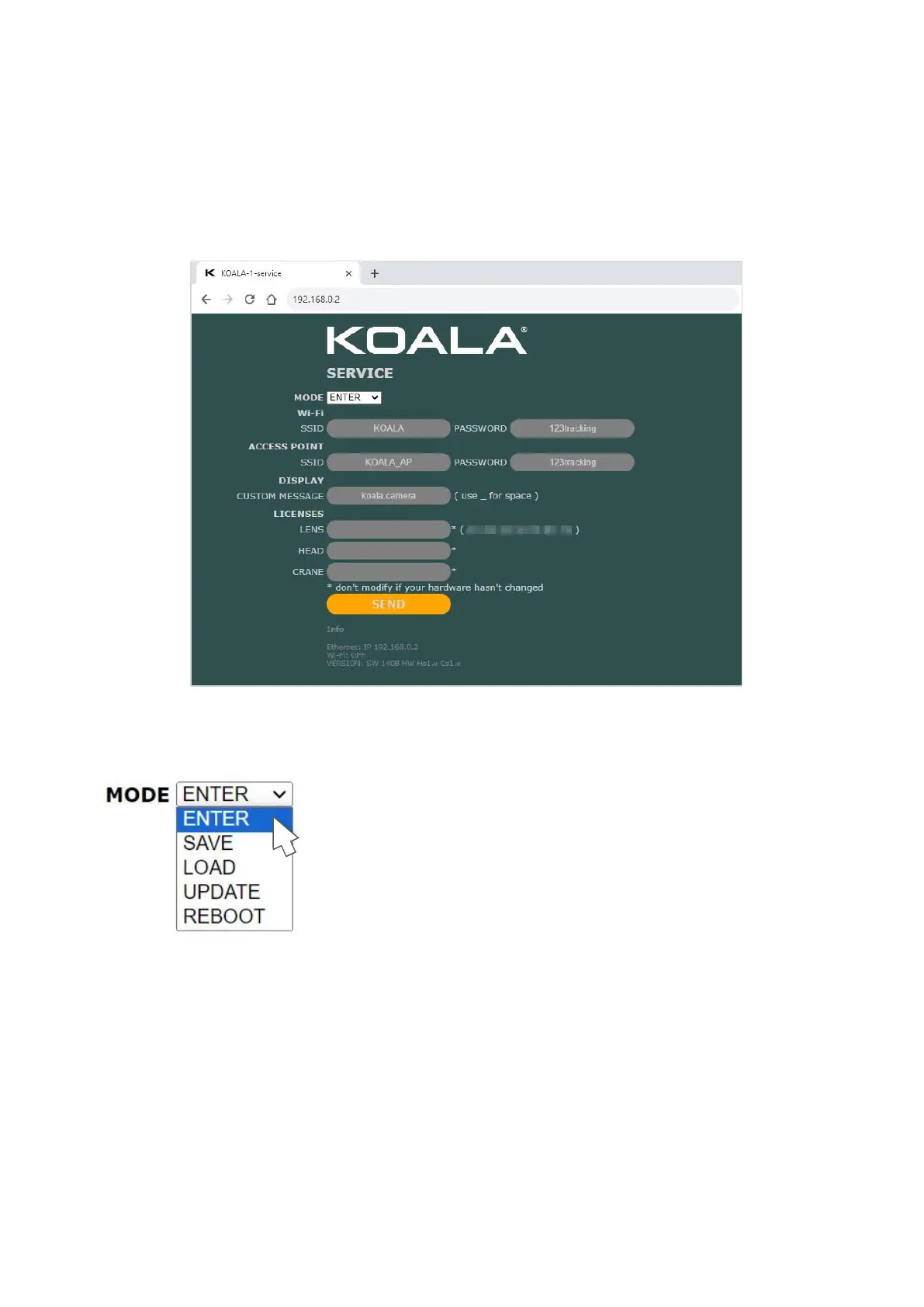 Ethernet or Wi-Fi, and then open the KOALA's IP in a browser to access the SERVICE WEB PAGE.