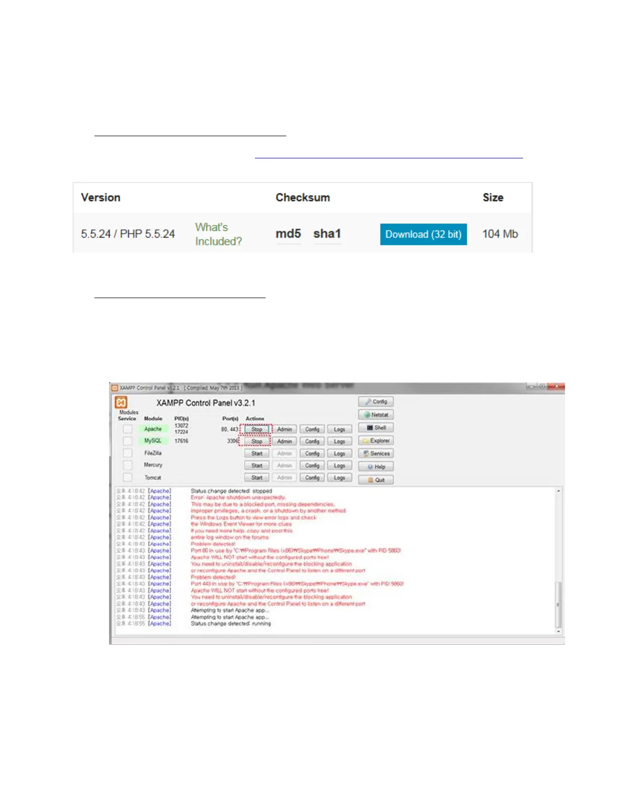 • Run the XAMPP Control Panel and make sure both Apache and MySQL can be