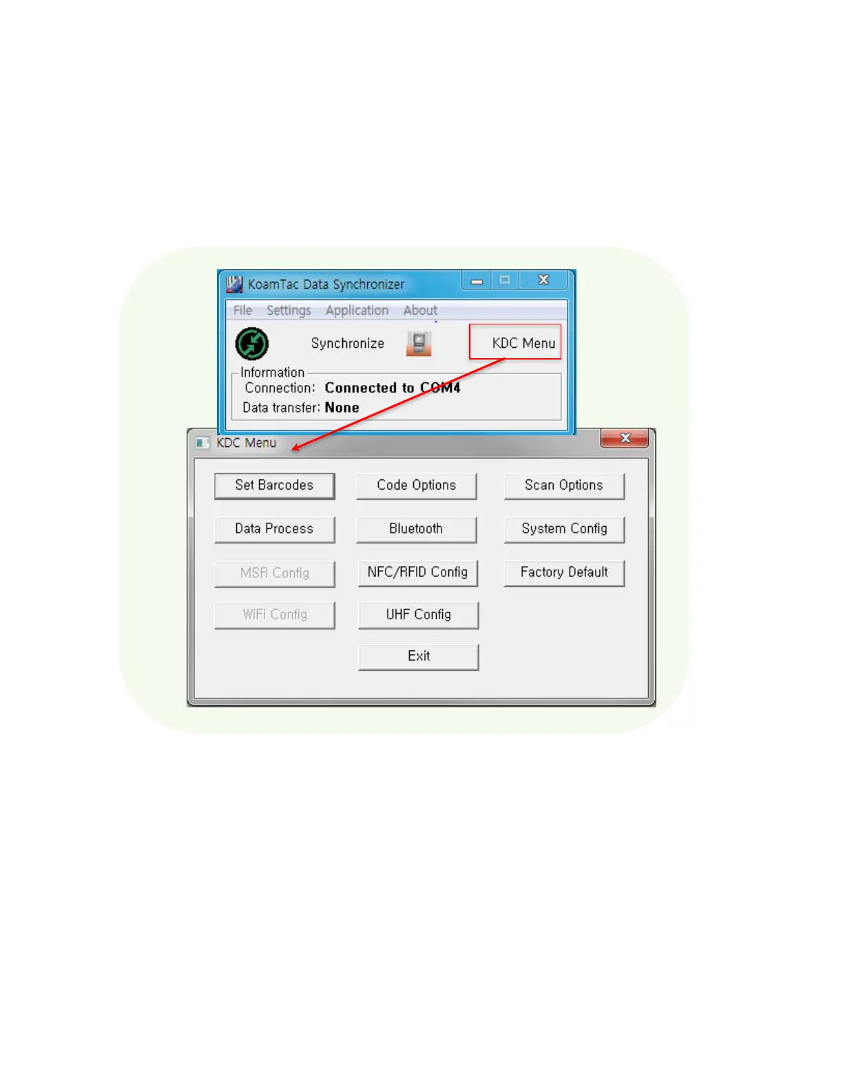 Menu on the right side of KTSync window. Click KDC Menu, and you may configure your KDC in