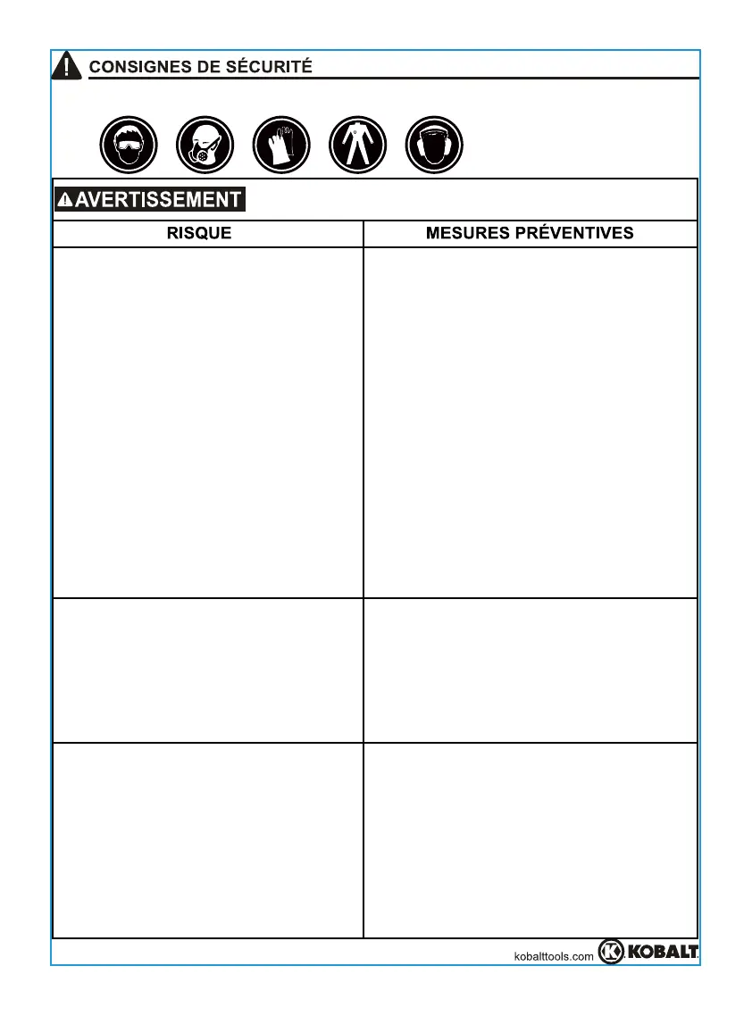 Lunettes de sécurité, masque anti-vapeurs, vêtements et protecteurs auditifs.