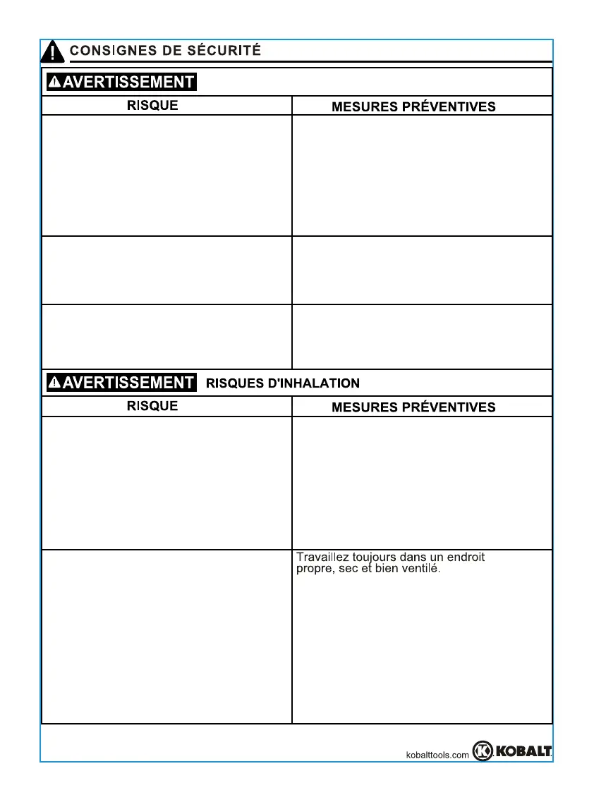 risques de blessure pour l’utilisateur et les