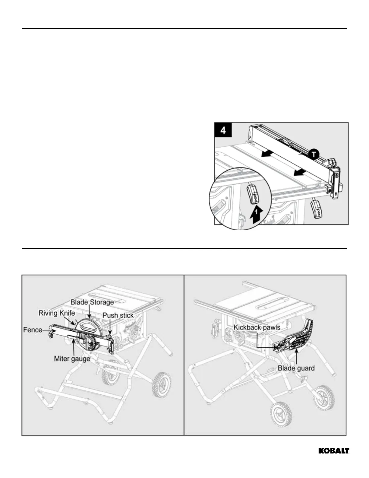 3. Raise locking levers to permit rip fence (T) to be