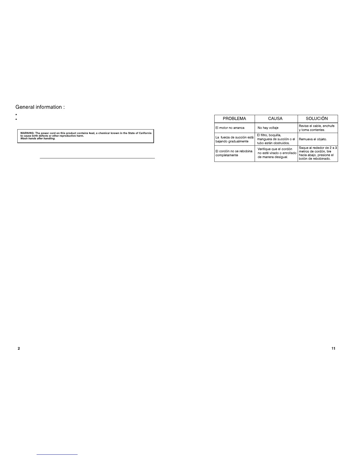 11. Do not use with a damaged cord or plug. If vacuum is not working as it should,
