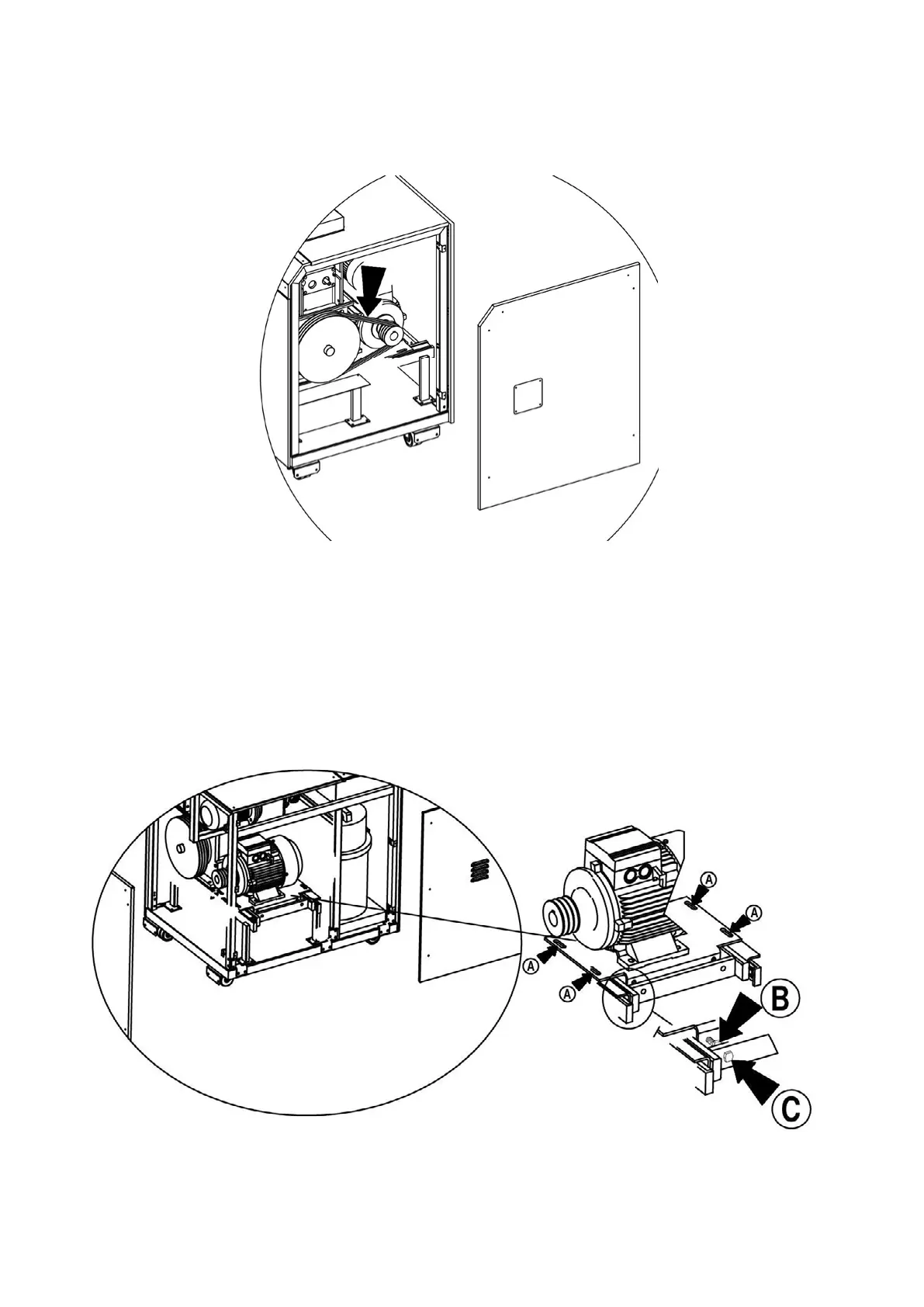 - Allentare le viti “A” e il dado “B”,avvitare le viti “C” quindi verificare che le cinghie abbiano un