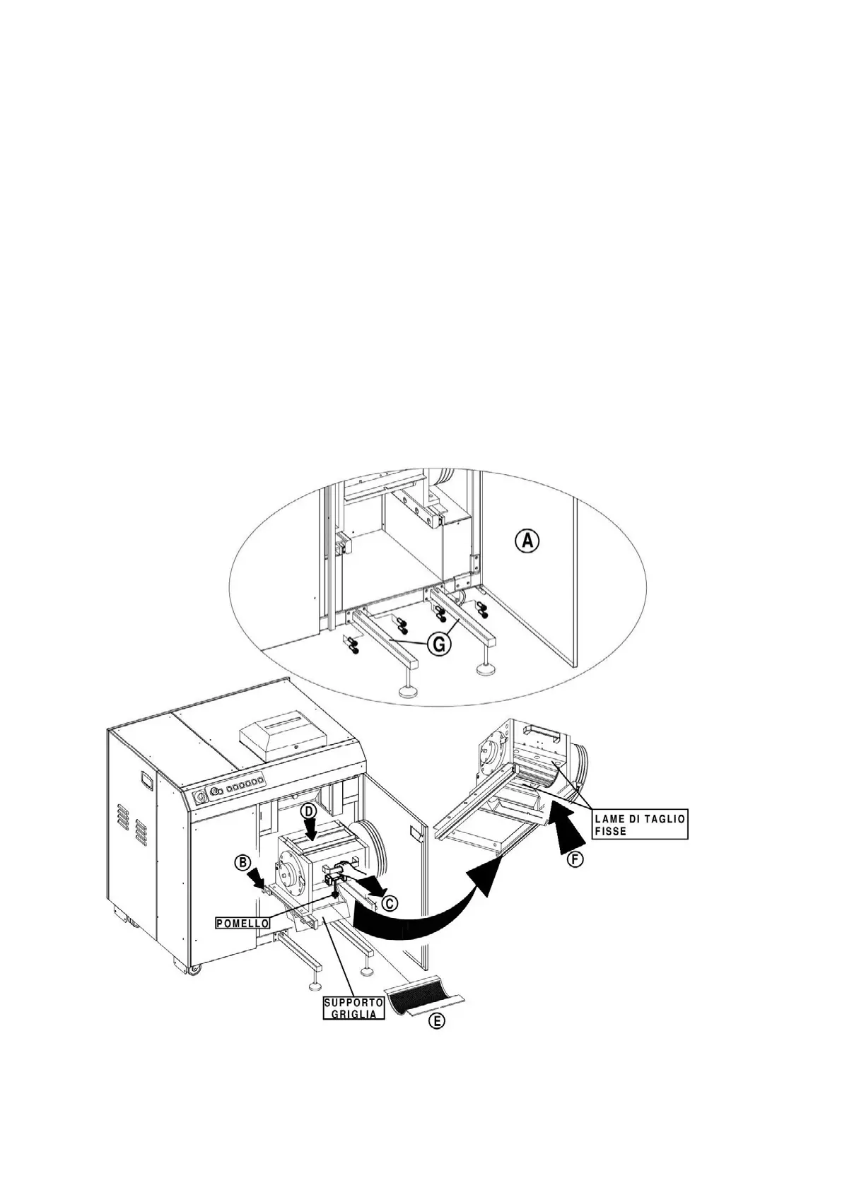 - Riposizionare la griglia “E” sul supporto griglia quindi serrare con il pomello.
