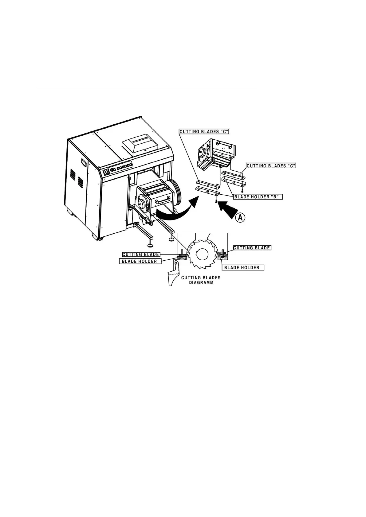 - Remove the blade supports “B” and cutting blades “C” as shown in the diagram.