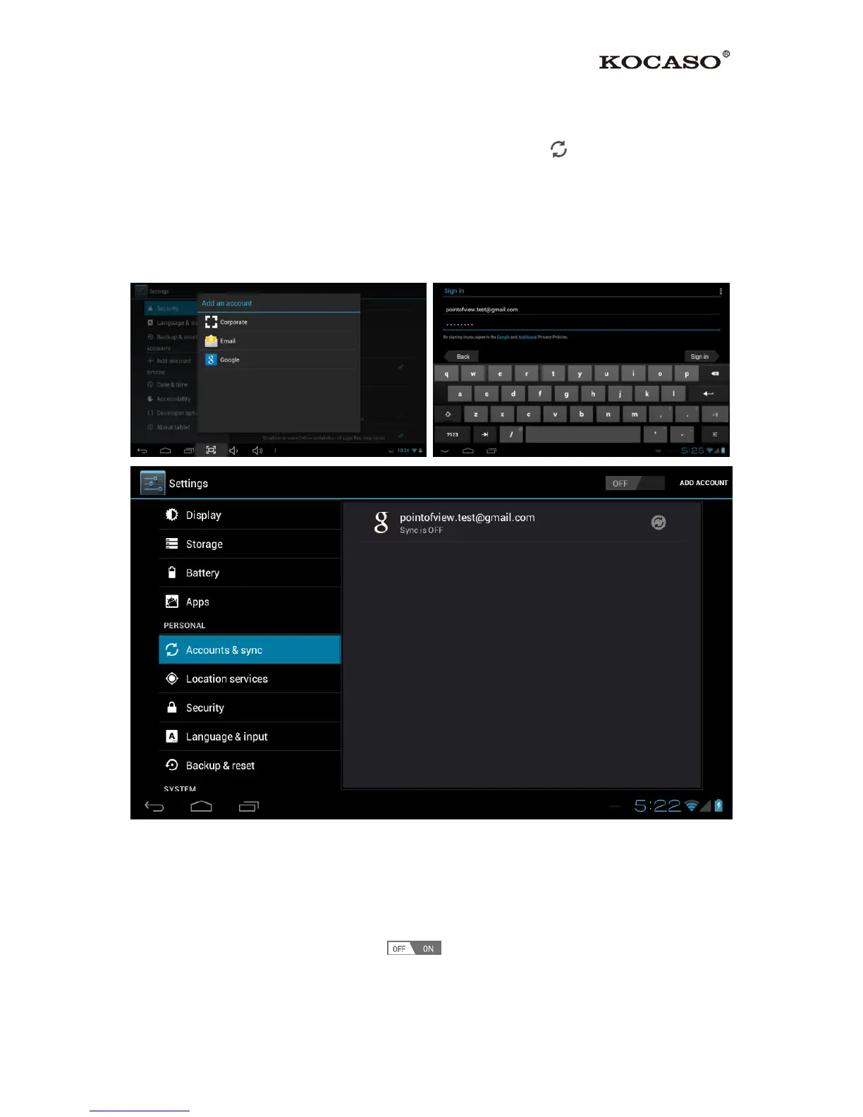 synchronization on and off by using the switch next to the ‘Add account’ option.