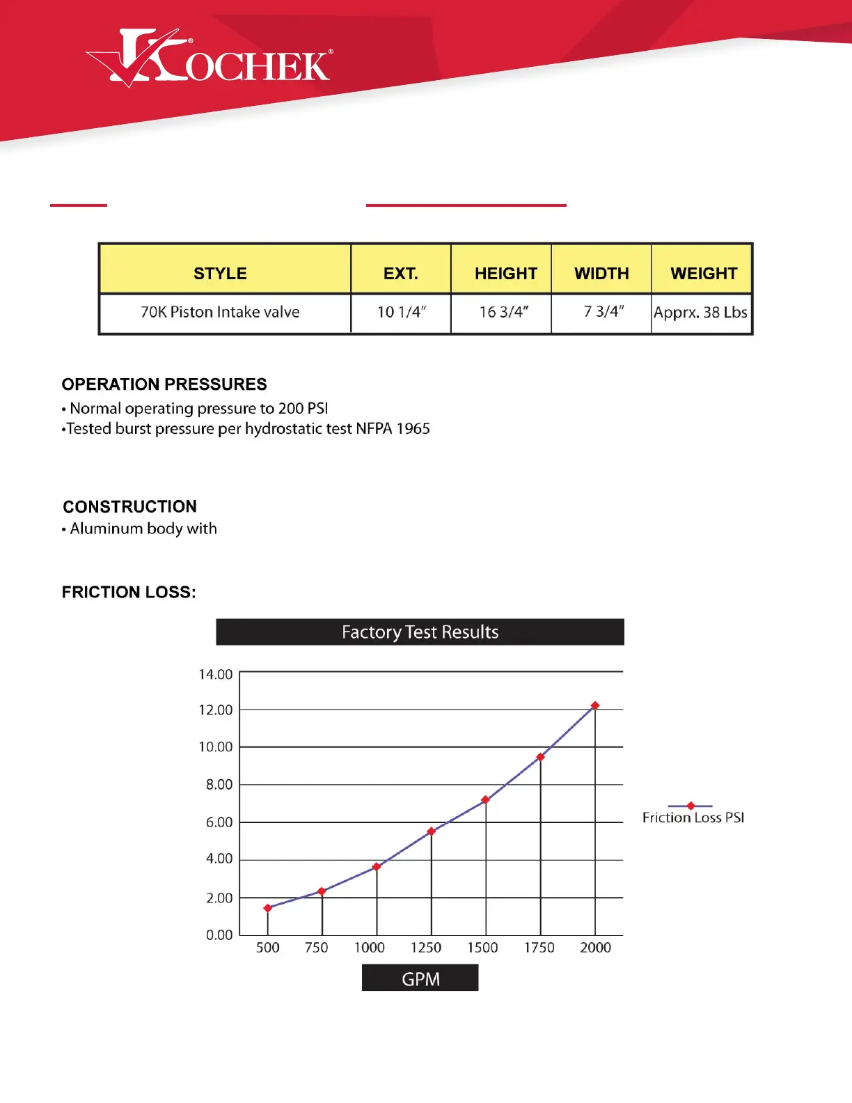 Kochek 70K - Specifications; Operation Pressures; Construction; Friction Loss