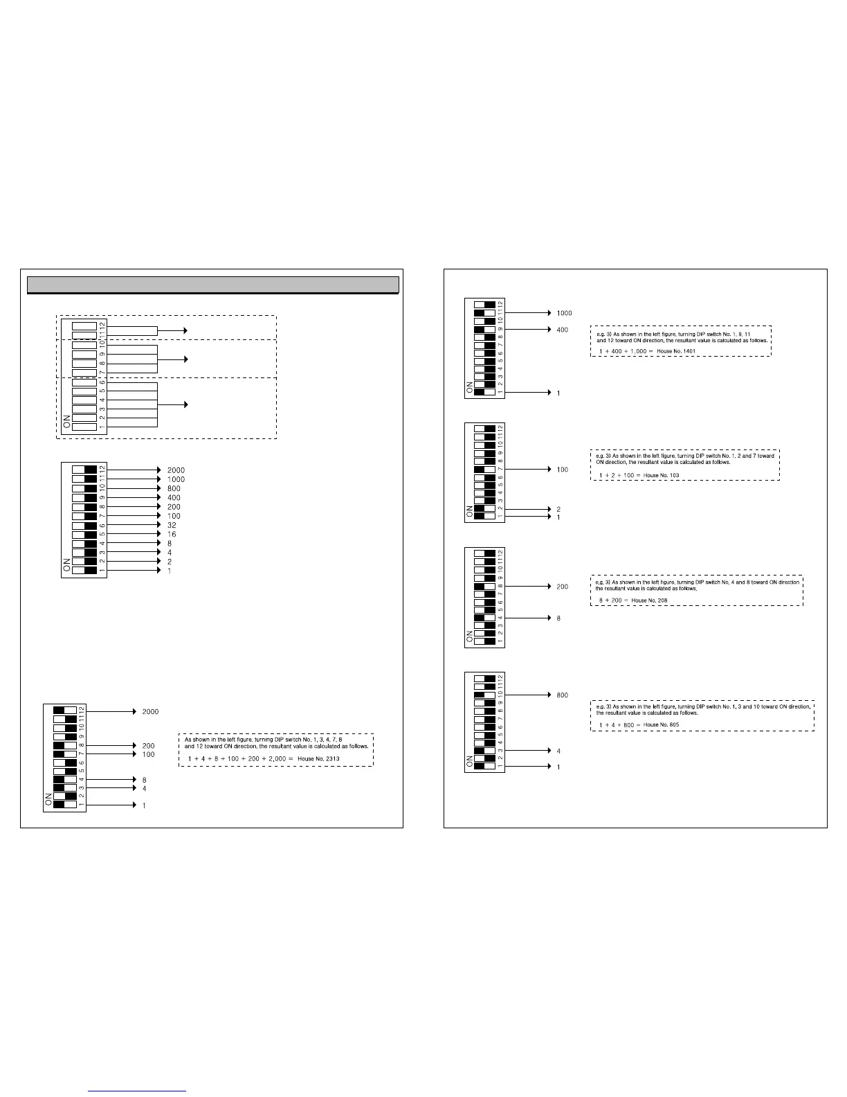 e.g. 1) Above figure, turning switch No.1 and No. 2 toward On direction, value is set at 3 (1 + 2 = 3) since