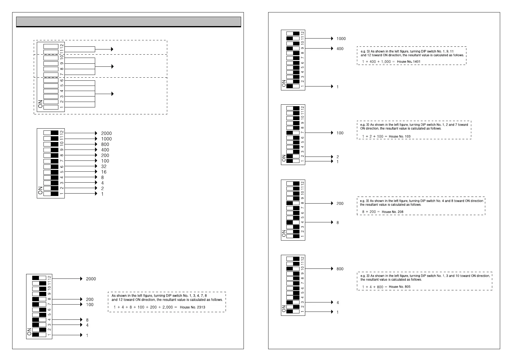 e.g. 1) Above figure, turning switch No.1 and No. 2 toward On direction, value is set at 3 (1 + 2 = 3) since