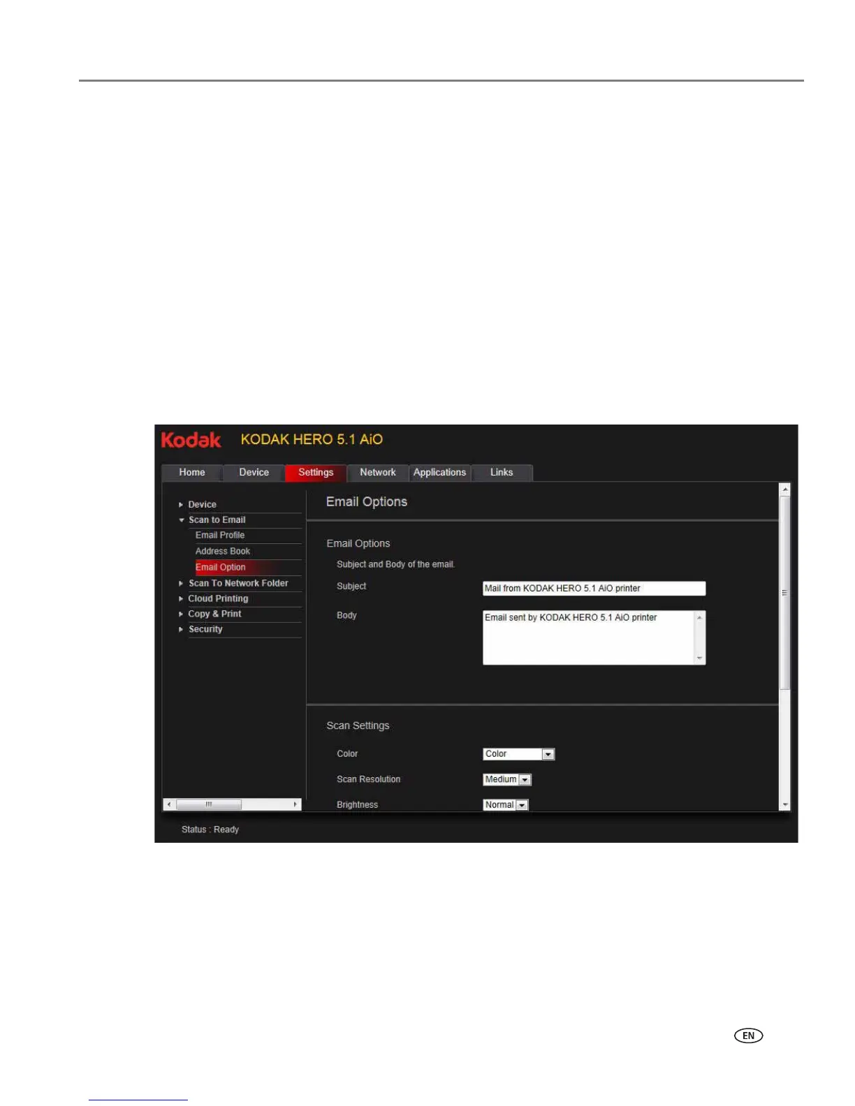 When you send a scan to an email address, the printer uses defaults — subject line,