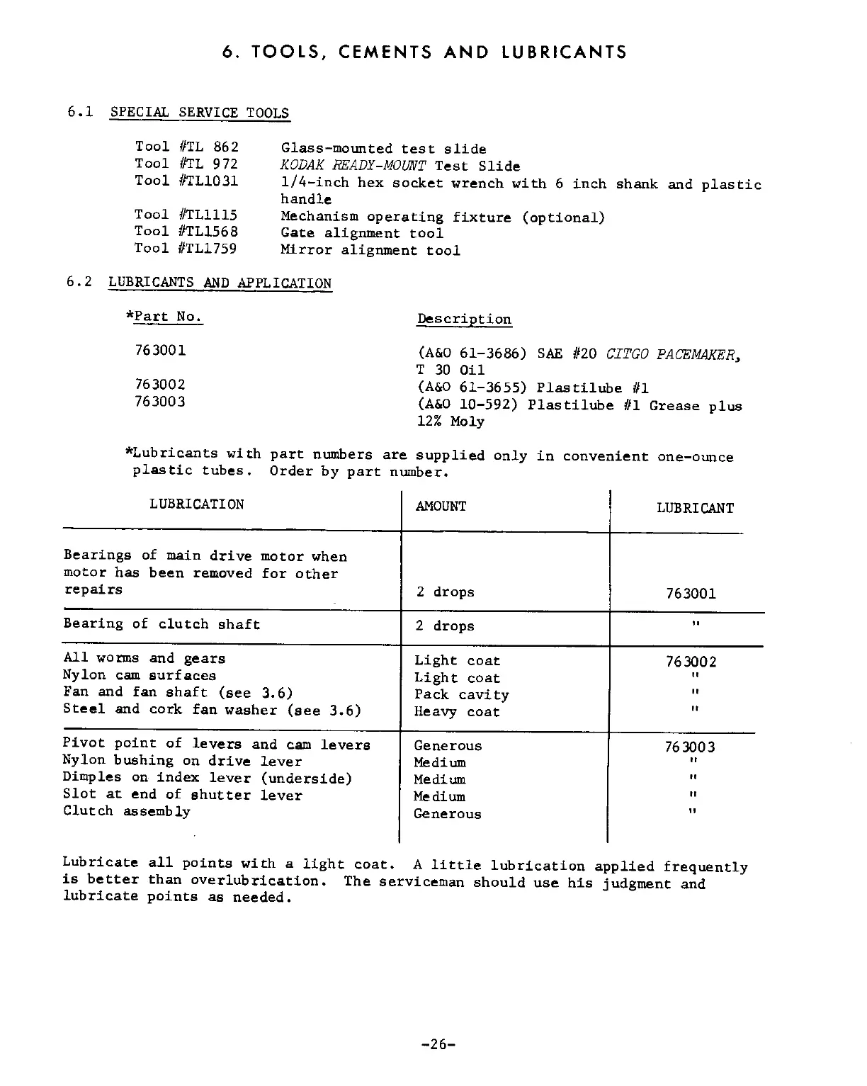 Kodak 650H - Tools, Cements and Lubricants; Special Service Tools