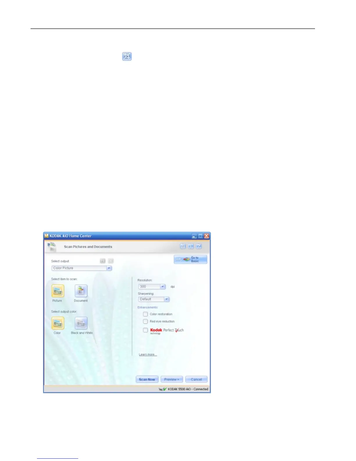 On the main Home Center window, click Scan Pictures and Documents to open the Basic Scan