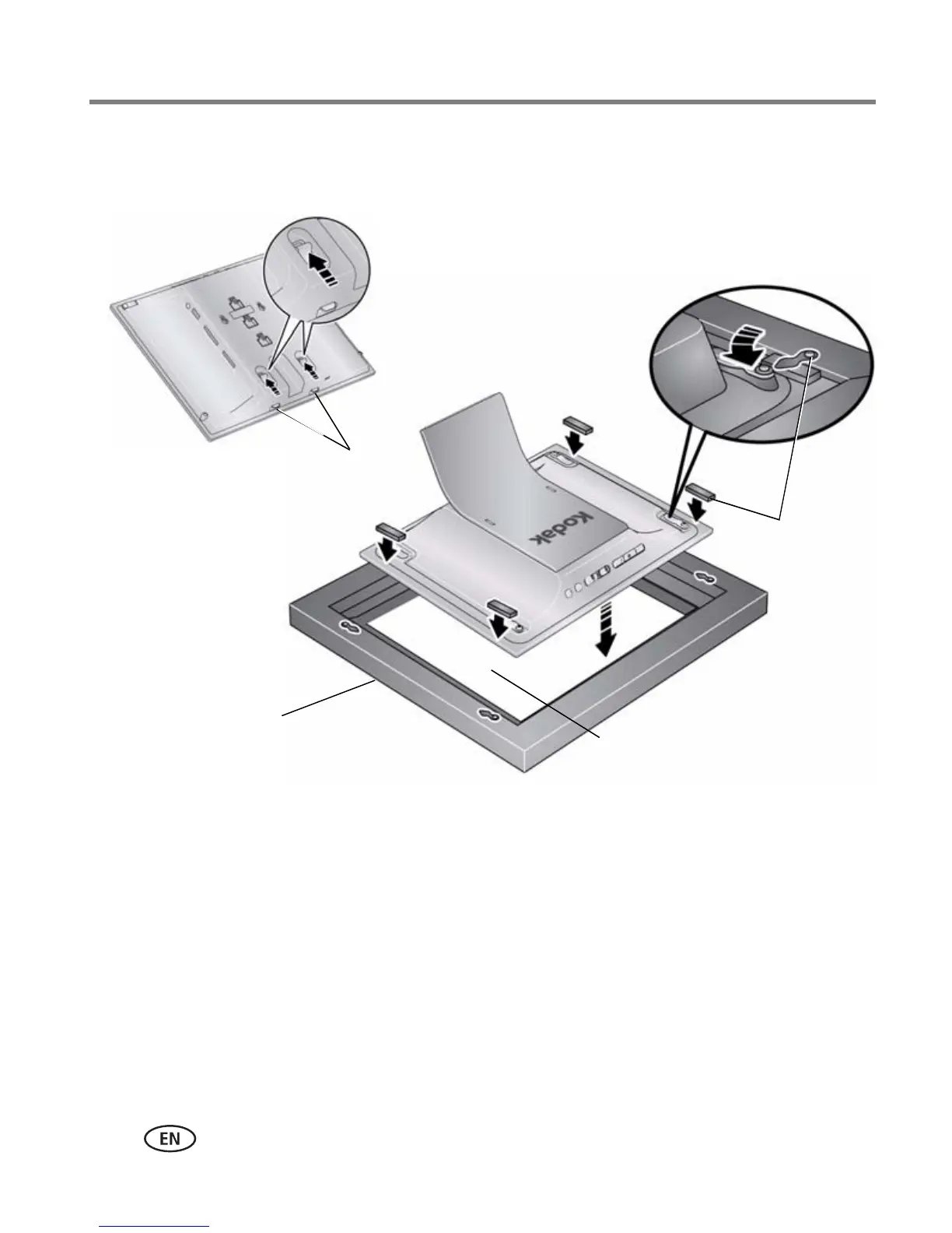 ■ Use the included self-stick foam spacers to fill any gap between the digital frame’s