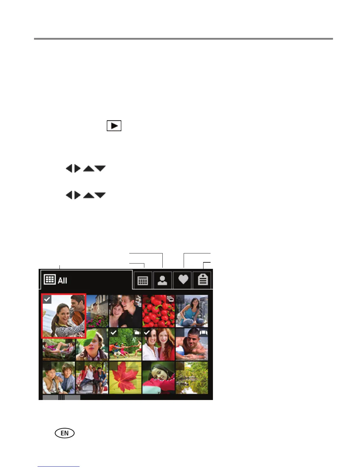 3 Press to choose a tab and sort pictures/videos by All, Date, People,