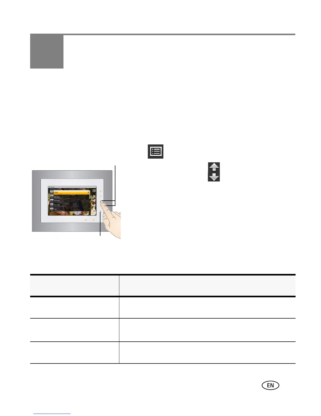 Use the Menu button to view and work with your pictures, and change your frame