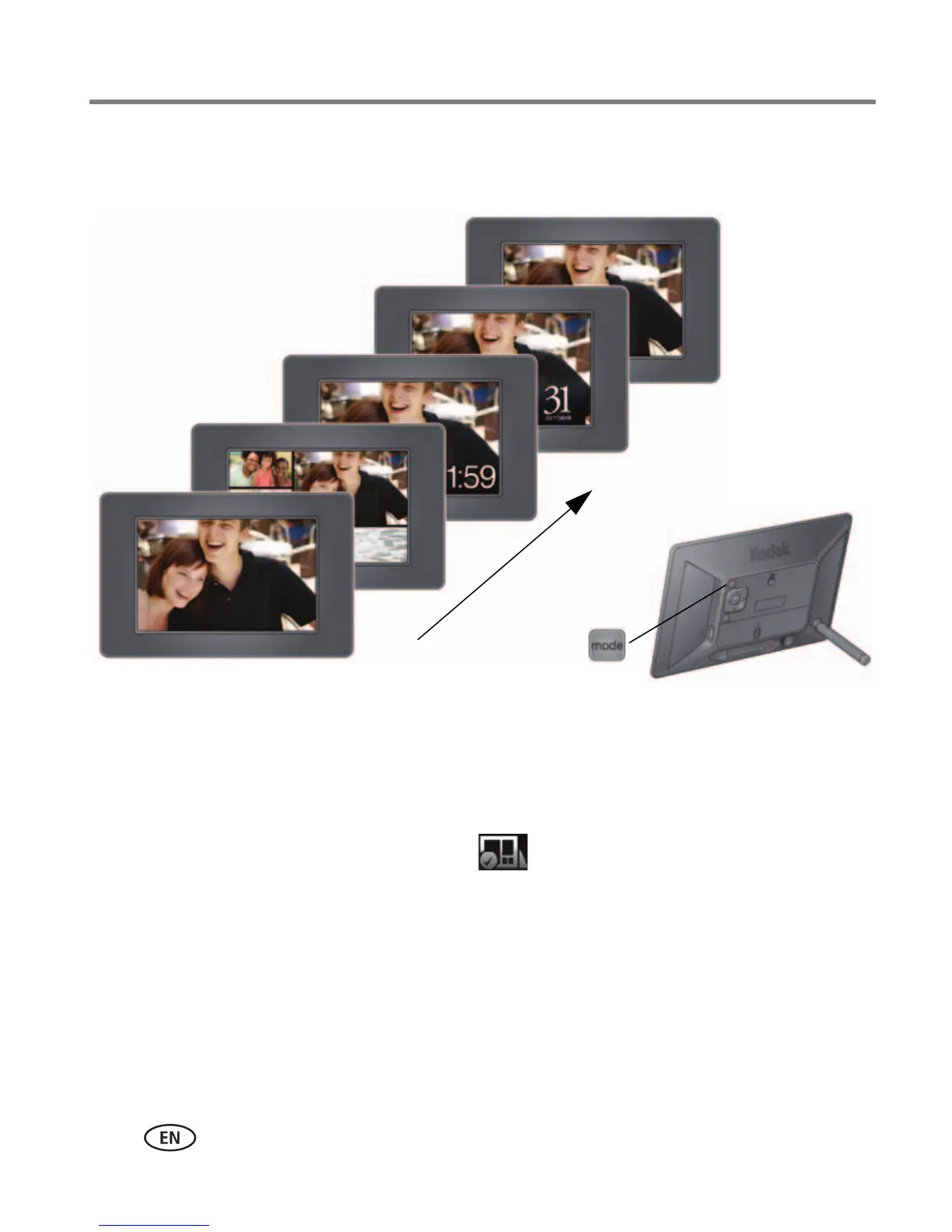 Available viewing modes are: single picture, collage, clock, and calendar.