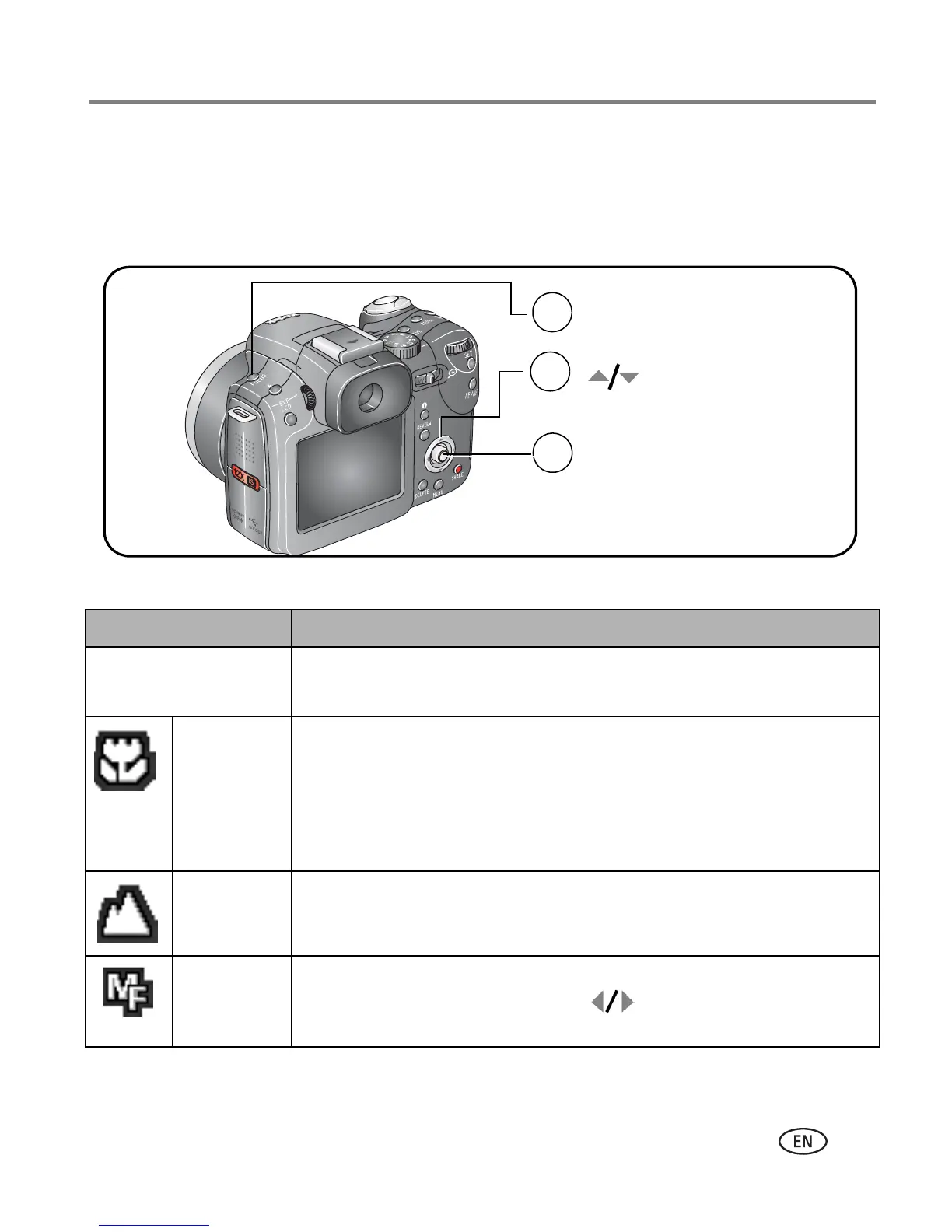Landscape Distant subjects. Auto-focus framing marks are unavailable. Flash is