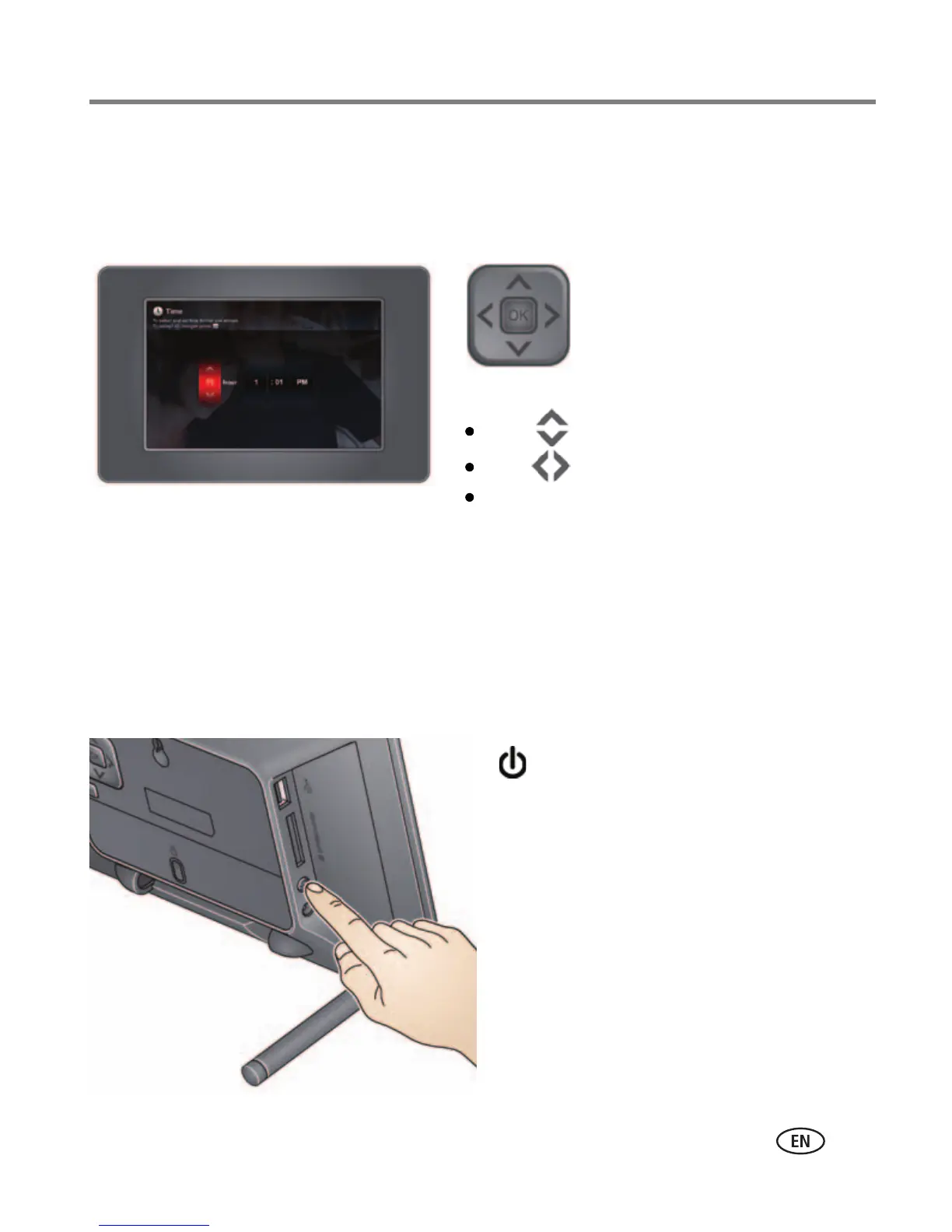 The first time you turn on your frame, the Time, Date, and On/Off screens appear
