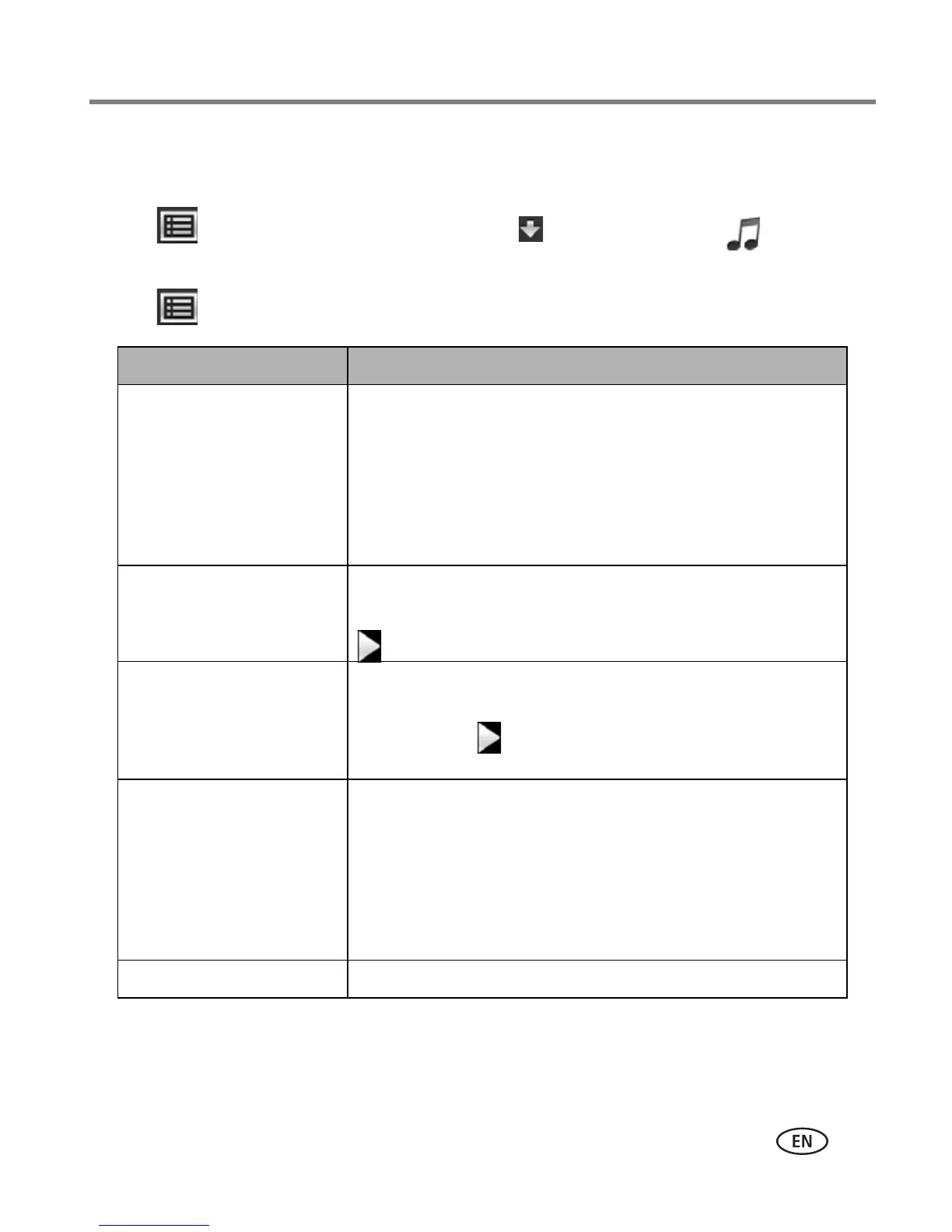 Music menu options Description