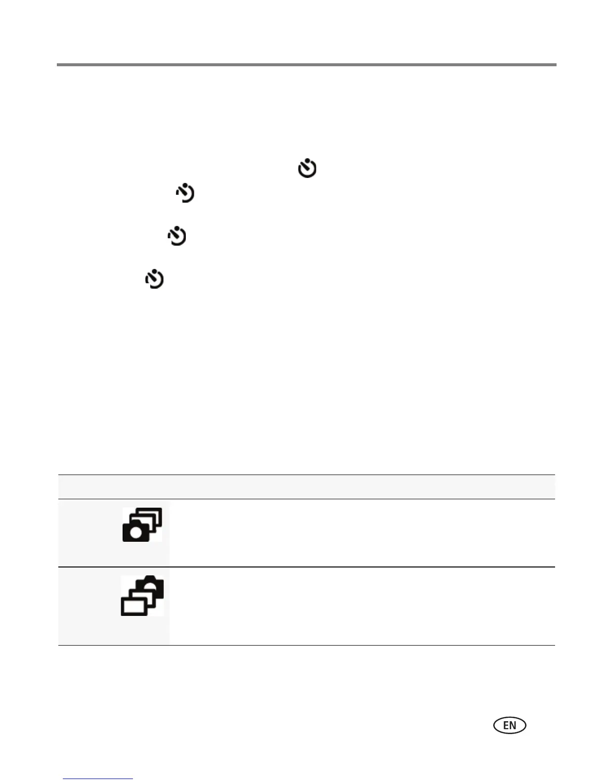 1 Repeatedly press the Self-timer/Burst button to choose a self-timer setting: